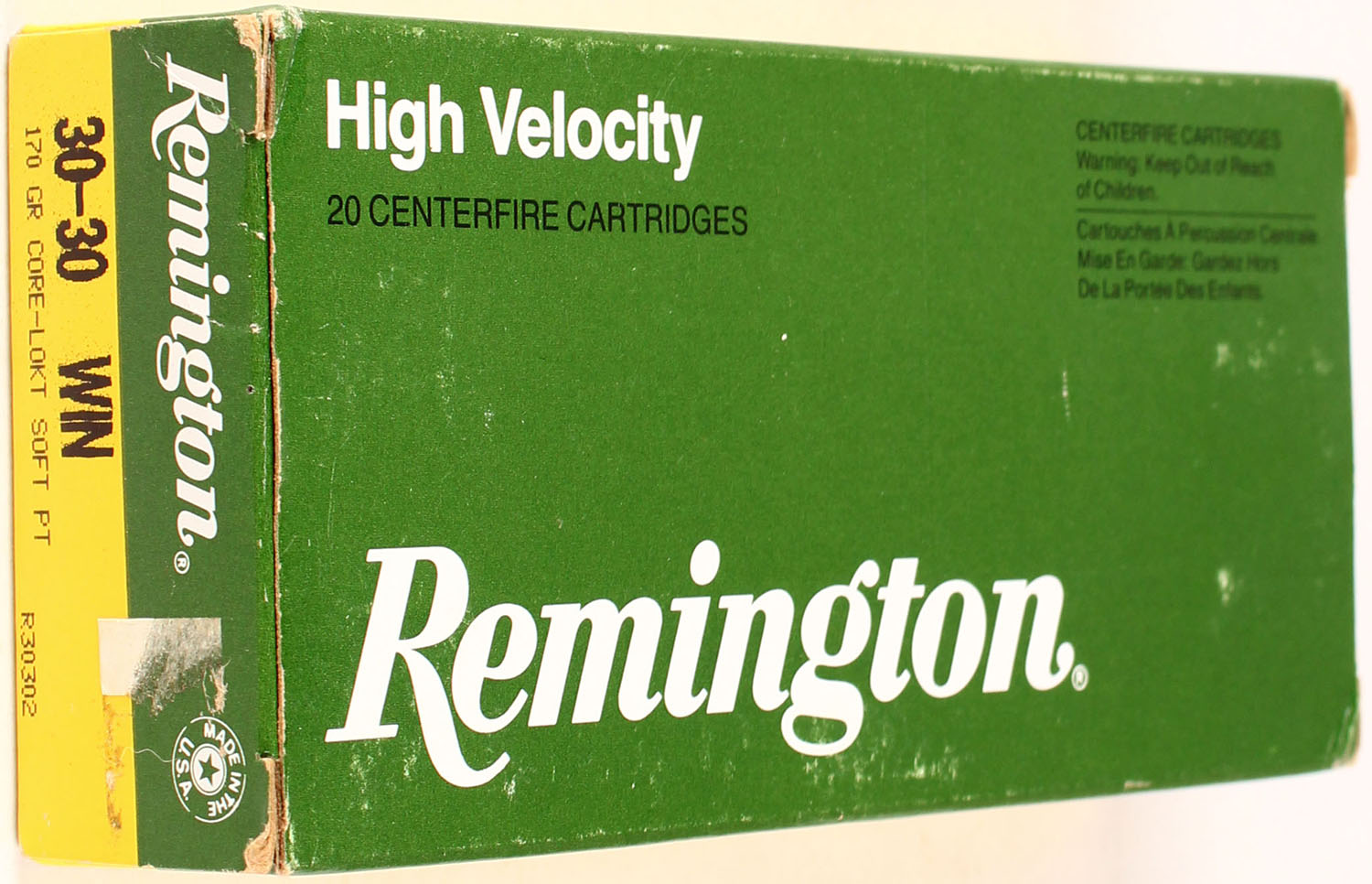 Remington, .30-30 Win., High Velocity, 170 Gr Core-Lokt Soft PT, 1pc, Full, green/yellow box with black/white print, box is solid with stickers & sticker marks, light rub marks & light edge wear, ammo is excellent. Grade: Excellent + - Value: 30 to 90