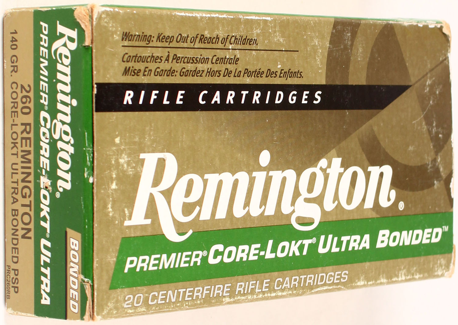 Remington, Premier Core-Lokt Ultra Bonded, .260 Remington, 140 Gr Core-Lokt Ultra Bonded Psp, Full, 1pc. Gold, green & white box, box is solid, minor shelf & edge wear, end flaps solid, ammo is excellent. Grade: Excellent+ - Value: 20 to 60