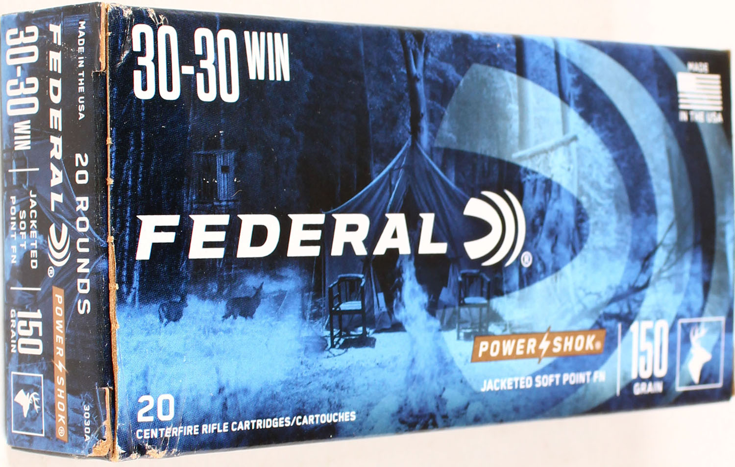 Federal, Power Shok, 30-30 Win, 150 Grain Jacketed Soft Point FN, Full, 1pc. multi-colored box, box is solid with excellent color, Ammo is excellent. Grade: Excellent ++ - Value: 20 to 80