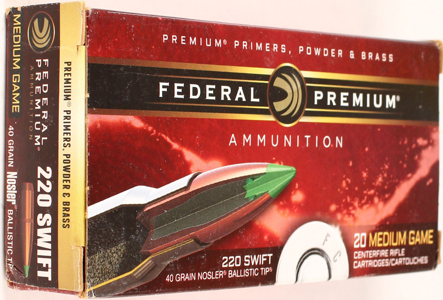 Federal Premium, Medium Game, 220 Swift, 40 Grain Nosler Ballistic Tip, Full, 1pc. multi-colored box, box is solid with excellent color, Ammo is excellent. Grade: Excellent ++ - Value: 20 to 80
