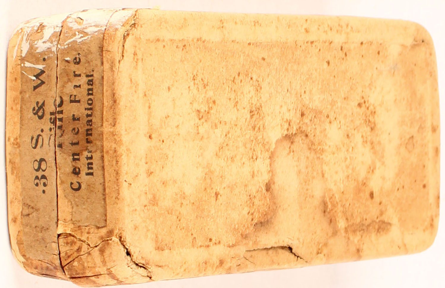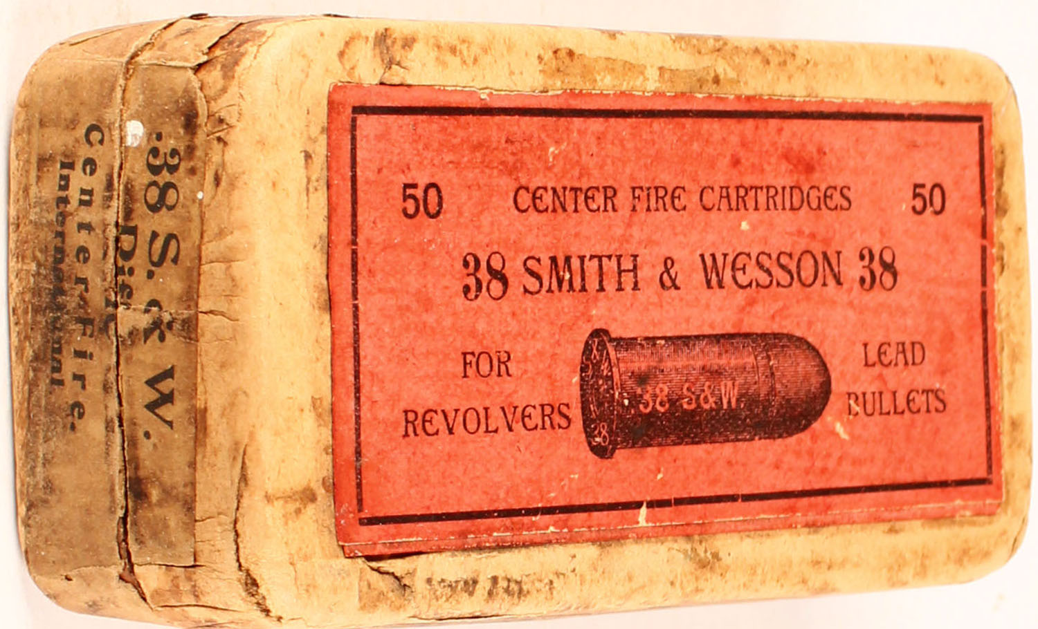 International, .38 S&W, Full, 2pc., Buff box, red label, & buff side sealing label, box is solid with very good color, age soiling some shelf wear and corner wear, puncture on bottom, labels are intact, ammo is excellent. Grade: Very Good ++ - Value: 30 to 120