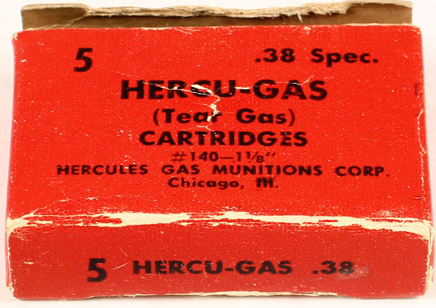 Hercules Gas-Munitions Corp, .38 Special Hercu-Gas (Tear Gas) Cartridges, Full 5rds, 1pc. Red box, box is solid with excellent color, edge & corner wear, bottom has been written on, no insert tab on back end flap, ammo is very good to excellent. Grade: Excellent - Value: 10 to 50