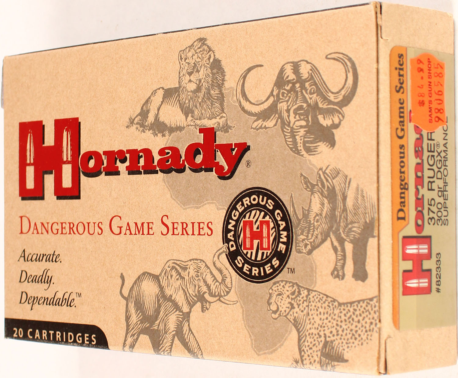 Hornady, 375 Ruger, 300 Grain DGX Superformance, Full, 1pc. multi-colored box, box is solid with excellent color, Ammo is excellent. Grade: Excellent ++ - Value: 20 to 80