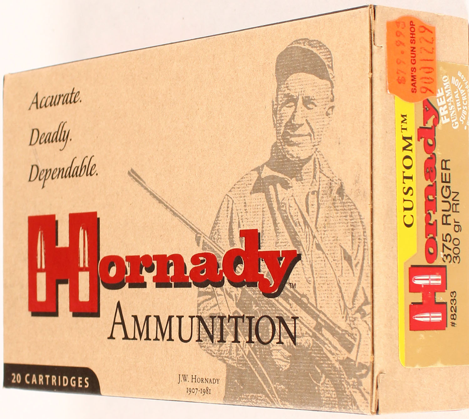 Hornady, 375 Ruger, 300 Grain RN, Full, 1pc. multi-colored box, box is solid with excellent color, Ammo is excellent. Grade: Excellent ++ - Value: 20 to 80