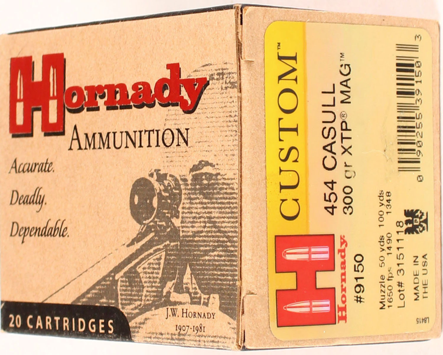 Hornady, 454 Casull, 300 Grain XTP Mag, Full, 1pc. multi-colored box, box is solid with excellent color, Ammo is excellent. Grade: Excellent ++ - Value: 20 to 80