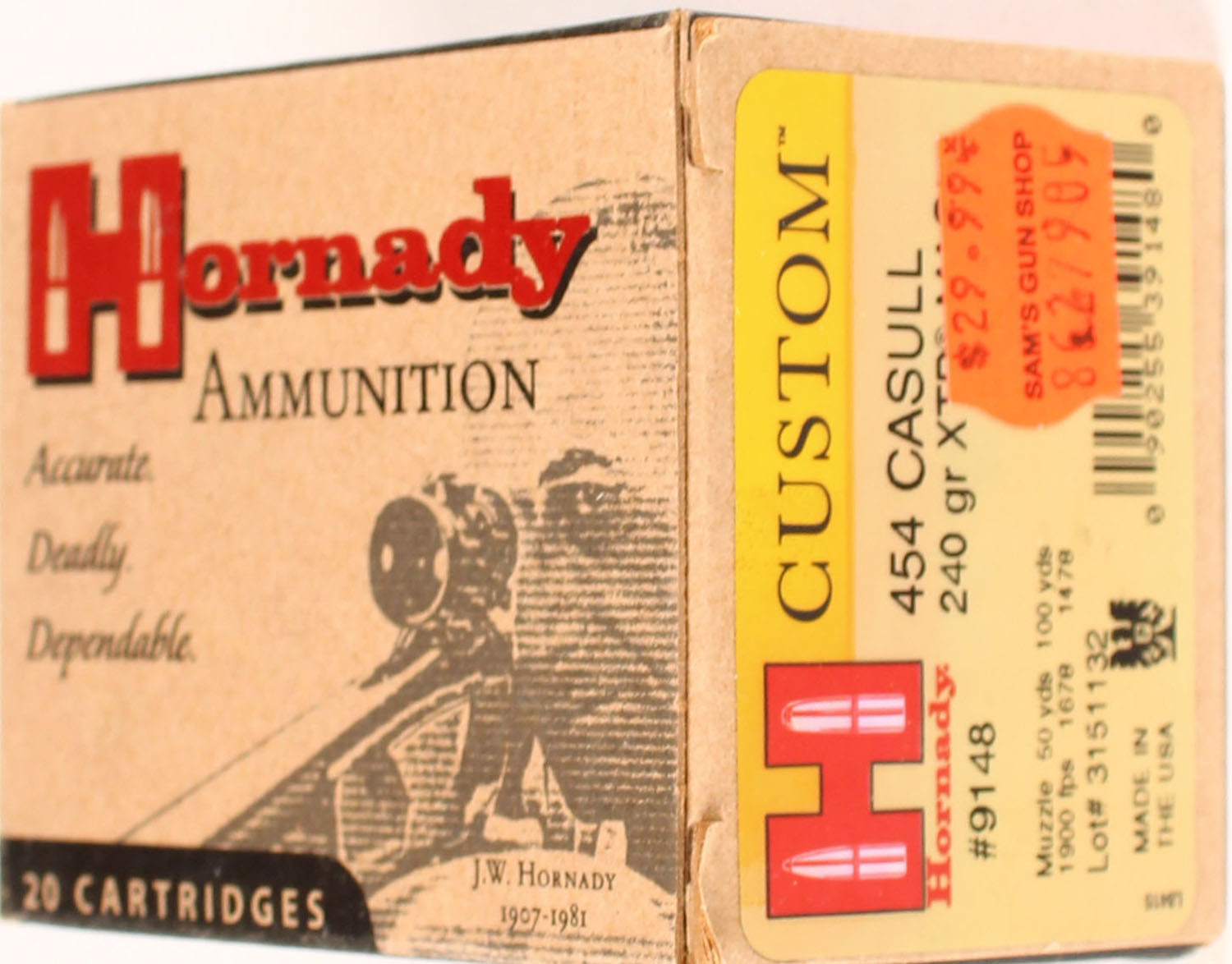 Hornady, 454 Casull, 240 Grain XTP Mag, Full, 1pc. multi-colored box, box is solid with excellent color, Ammo is excellent. Grade: Excellent ++ - Value: 20 to 80