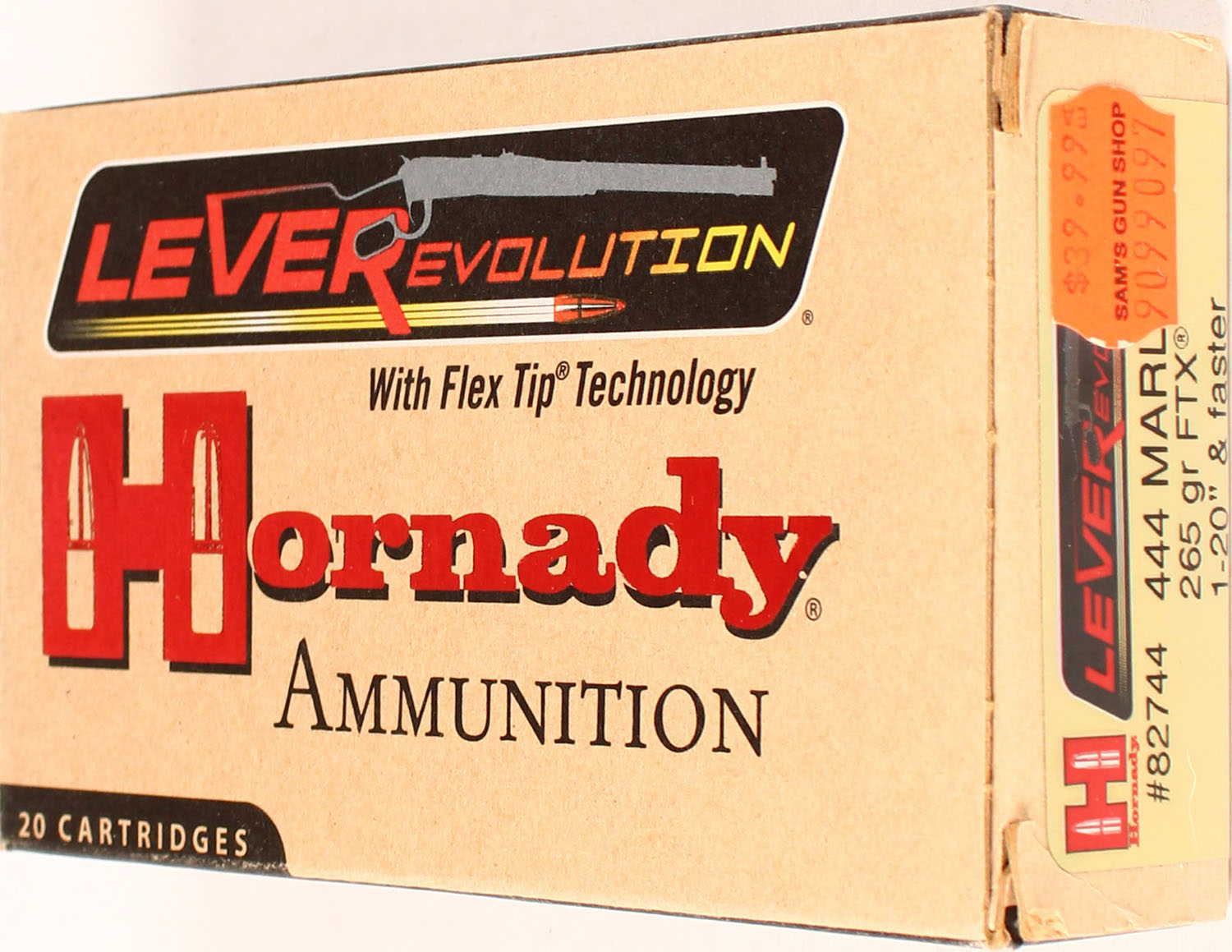 Hornady, LeveRevolution, 444 Marlin, 265 Grain FTX, Full, 1pc. multi-colored box, box is solid with excellent color, Ammo is excellent. Grade: Excellent ++ - Value: 20 to 80