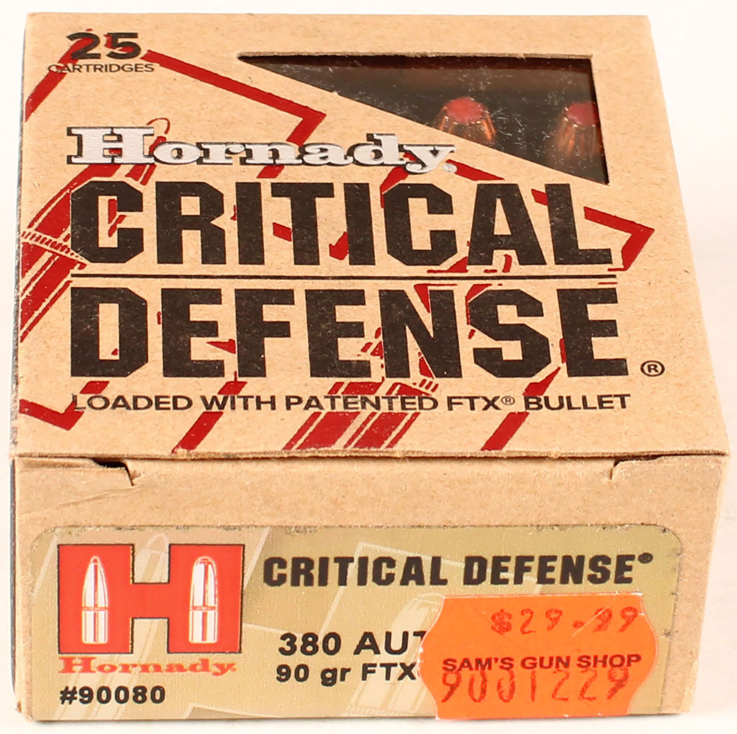 Hornady, Critical Defense, 380 Auto, 90 Grain FTX, Full, 1pc. multi-colored box, box is solid with excellent color, Ammo is excellent. Grade: Excellent ++ - Value: 20 to 80