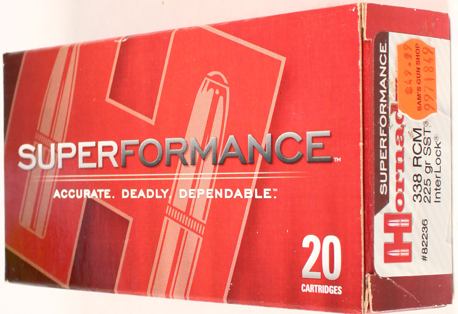 Hornady, Superformance, 338 RCM, 225 Grain SST Interlock, Full, 1pc. multi-colored box, box is solid with excellent color, Ammo is excellent. Grade: Excellent ++ - Value: 20 to 80