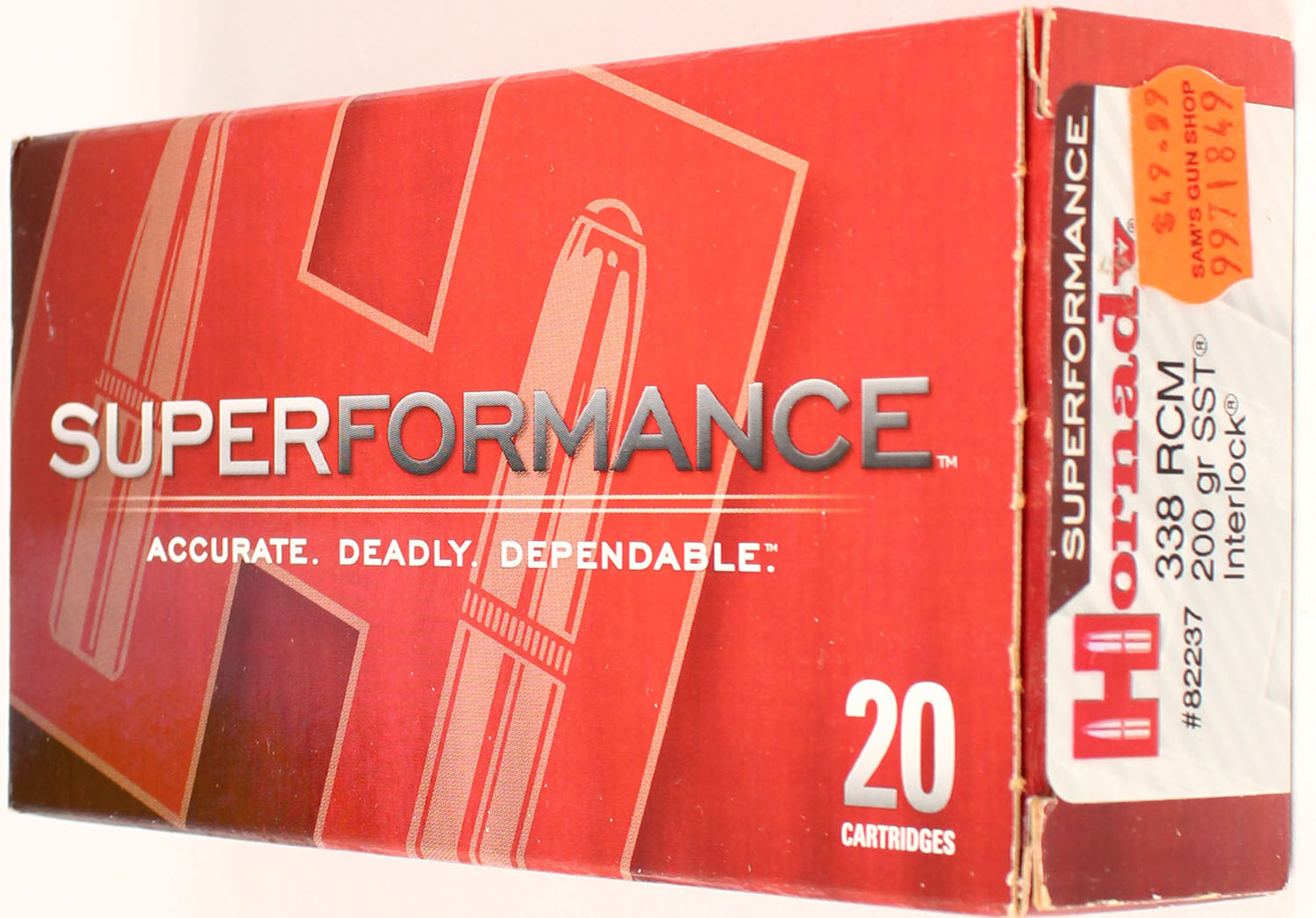 Hornady, Superformance, 338 RCM, 200 Grain SST Interlock, Full, 1pc. multi-colored box, box is solid with excellent color, Ammo is excellent. Grade: Excellent ++ - Value: 20 to 80