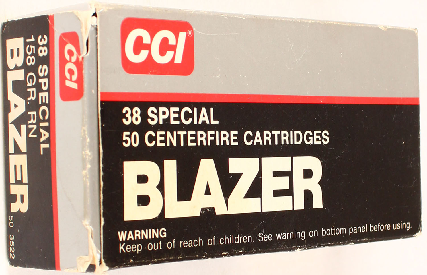 CCI, Blazer, 38 Special, 158 Grain RN, Full, 1pc. multi-colored box, box is solid with excellent color light edge wear, Ammo is excellent. Grade: Excellent + - Value: 20 to 80