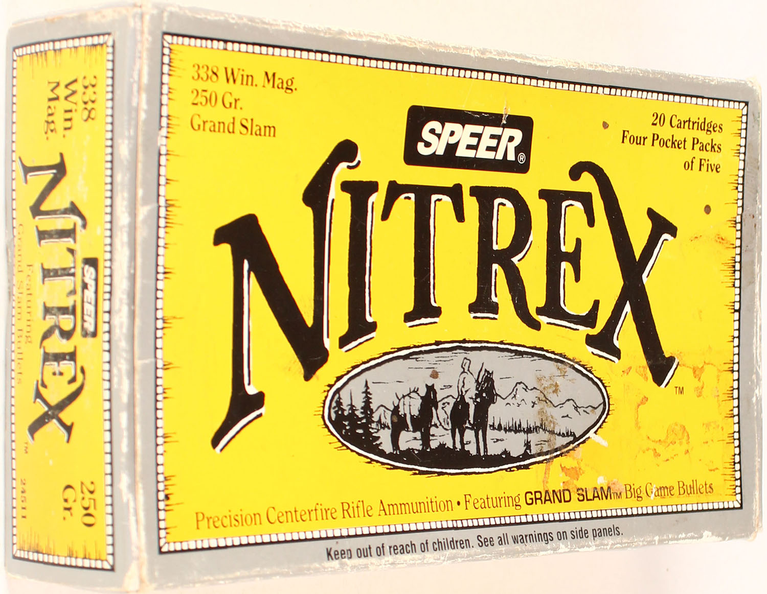 Speer, Nitrex, 338 Win Mag, 250 Grain Grand Slam, Full, 1pc. multi-colored box, box is solid, with excellent color, light edge wear & light age soiling, Ammo is excellent. Grade: Excellent - Value: 20 to 80