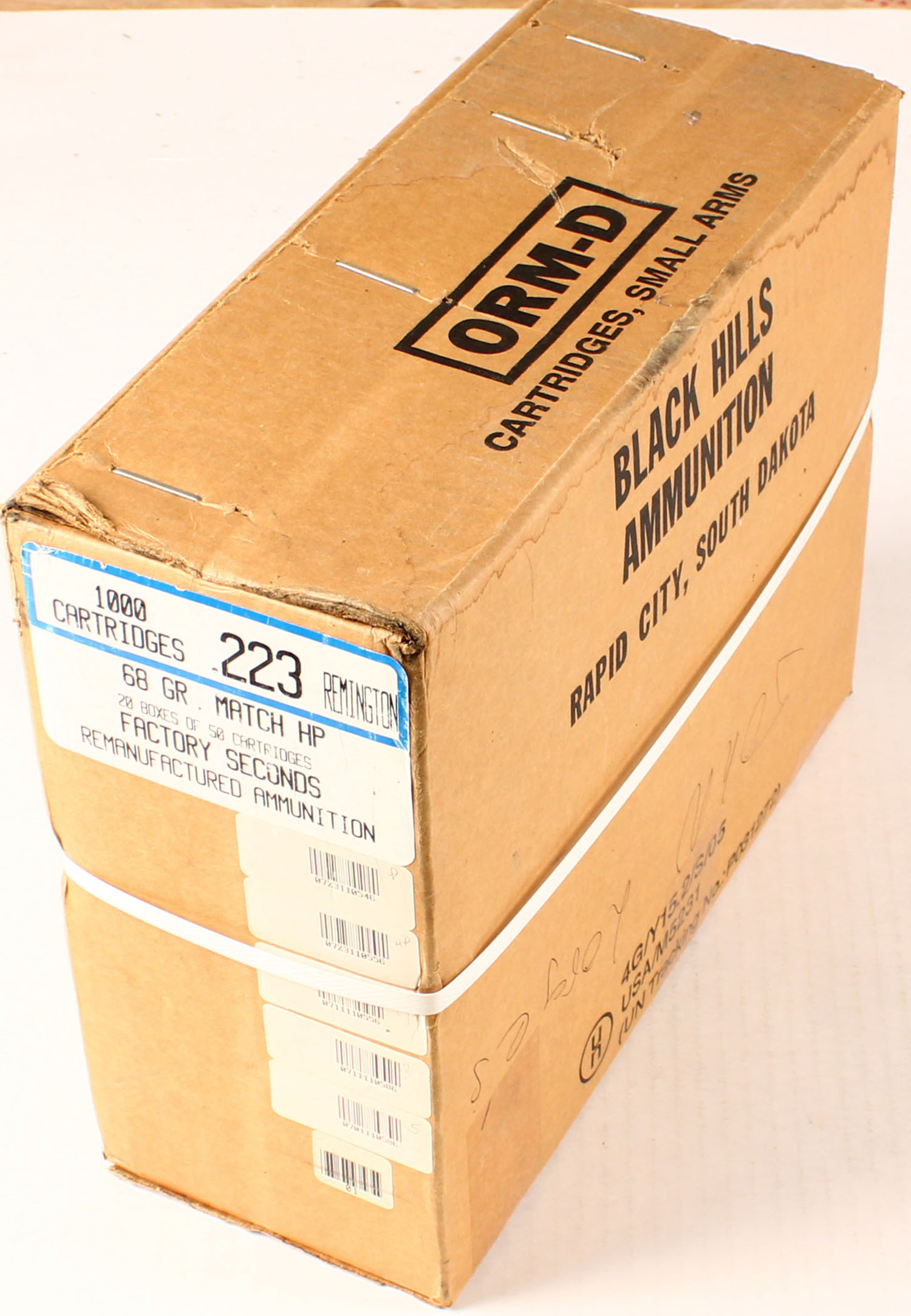 Black Hills Ammunition, Factory Seconds, 223 Remington, 68 Grain Match HP, FULL & SEALED Case of 1000rds, 1pc. multi-colored box, box is solid, with excellent color, Ammo is excellent. Grade: Excellent ++ - Value: 300 to 1200