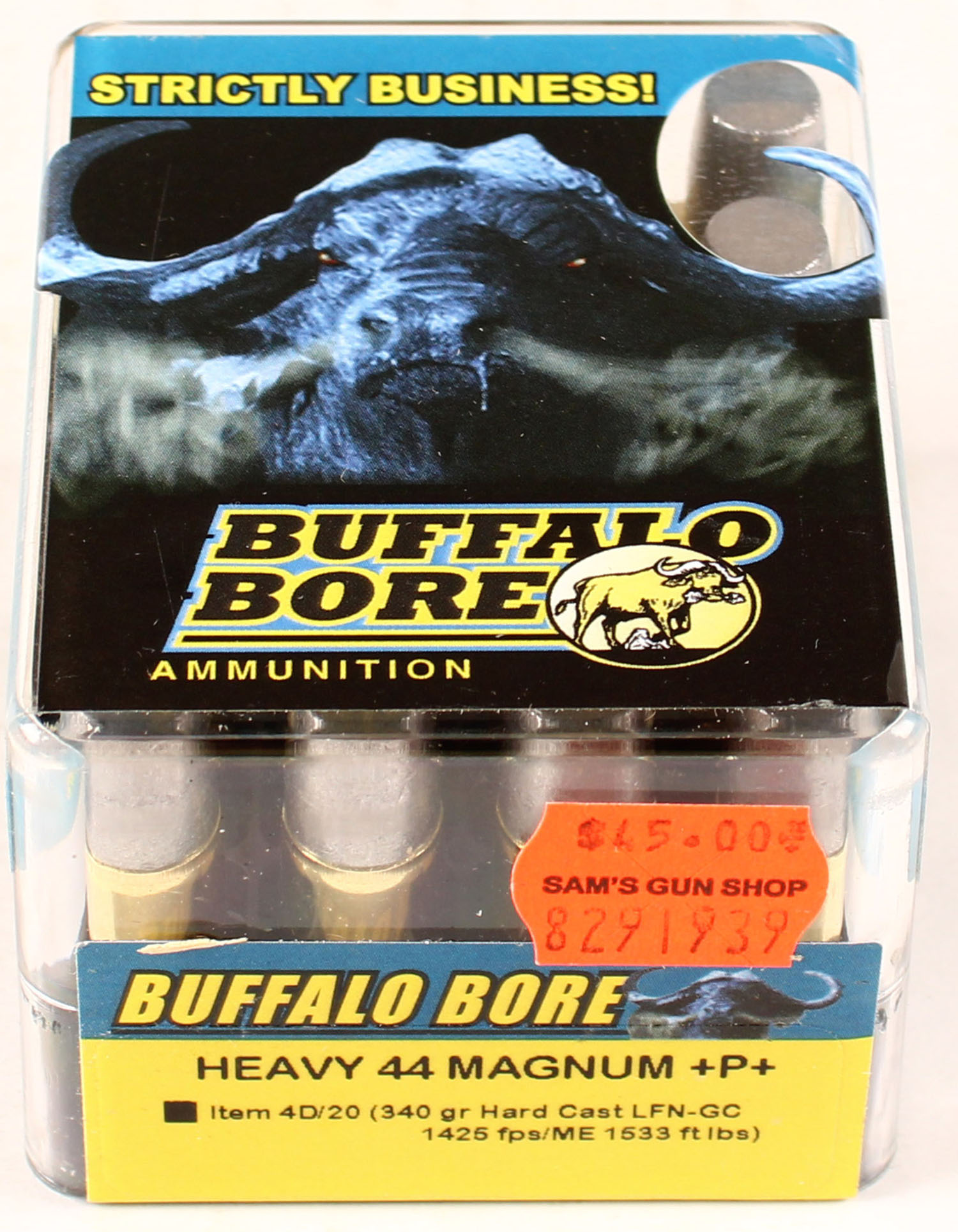 Buffalo Bore, Heavy 44 Mag !W%W!, 340 Grain LFN-GC, FULL & SEALED, 1pc. multi-colored box, box is solid, with excellent color. Grade: Excellent ++ - Value: 20 to 80