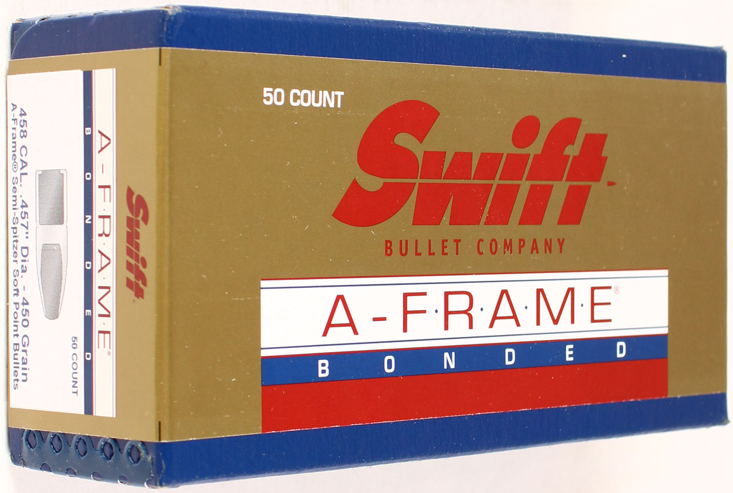 Swift, A-Frame Bonded, 458 Cal Bullets, 450 Grain Semi-Spitzer Soft Point, FULL & SEALED, 1pc. multi-colored box, box is solid, with excellent color. Grade: Excellent ++ - Value: 20 to 80