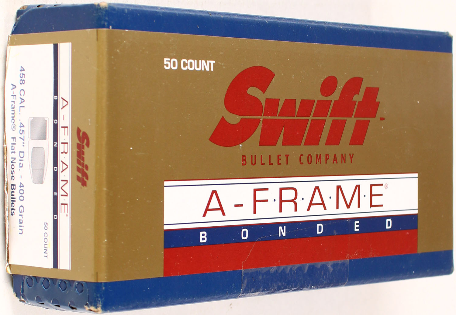 Swift, A-Frame Bonded, 458 Cal Bullets, 400 Grain Flat Nose, Full, 1pc. multi-colored box, box is solid, with excellent color, Ammo is excellent. Grade: Excellent ++ - Value: 20 to 80