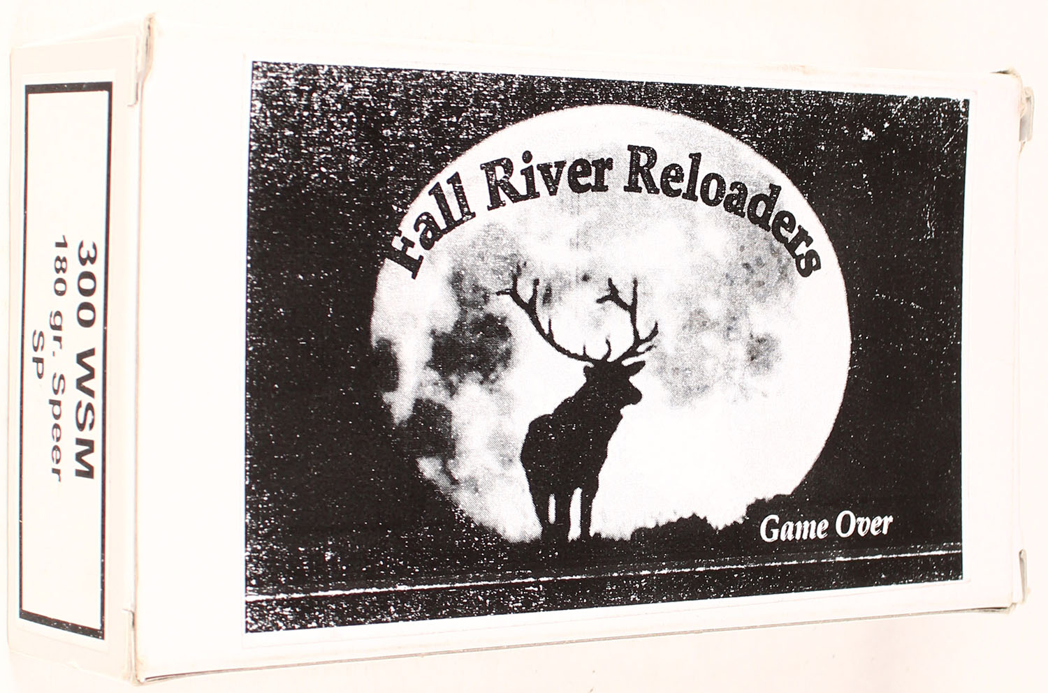 Fall River Reloading, Game Over, 300 WSM, 180 Grain Speer SP, Full, 1pc. multi-colored box, box is solid, with excellent color, Ammo is excellent. Grade: Excellent ++ - Value: 4 to 80