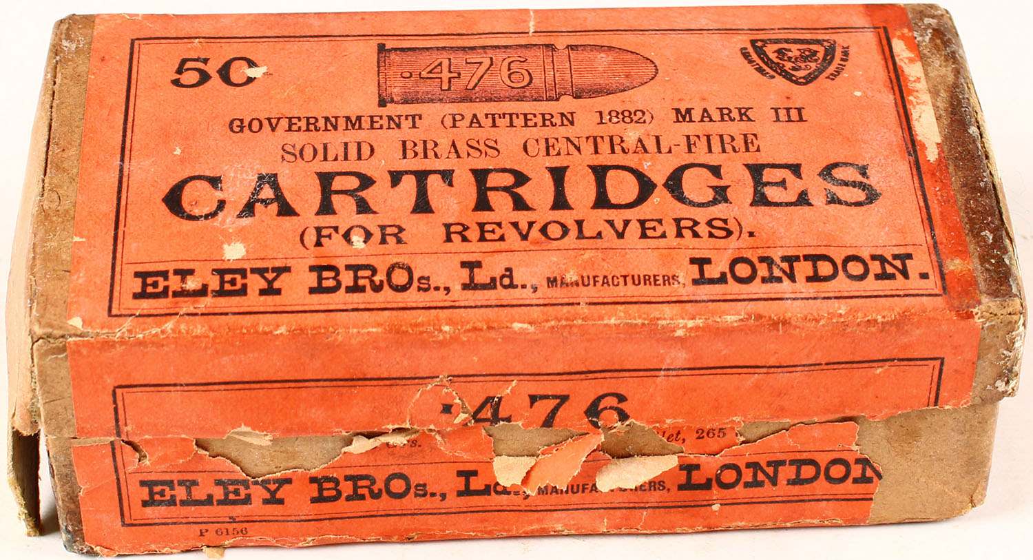 Eley Bros., .476 Government Mark III, Full, 2pc. Buff box with red wraparound label, box is solid with very good color, some age soiling, staining on right end partial seam split to bottom right edge, some edge & corner wear, label is 99% intact, ammo is very good to excellent. Grade: Very Good ++ - Value: 30 to 120