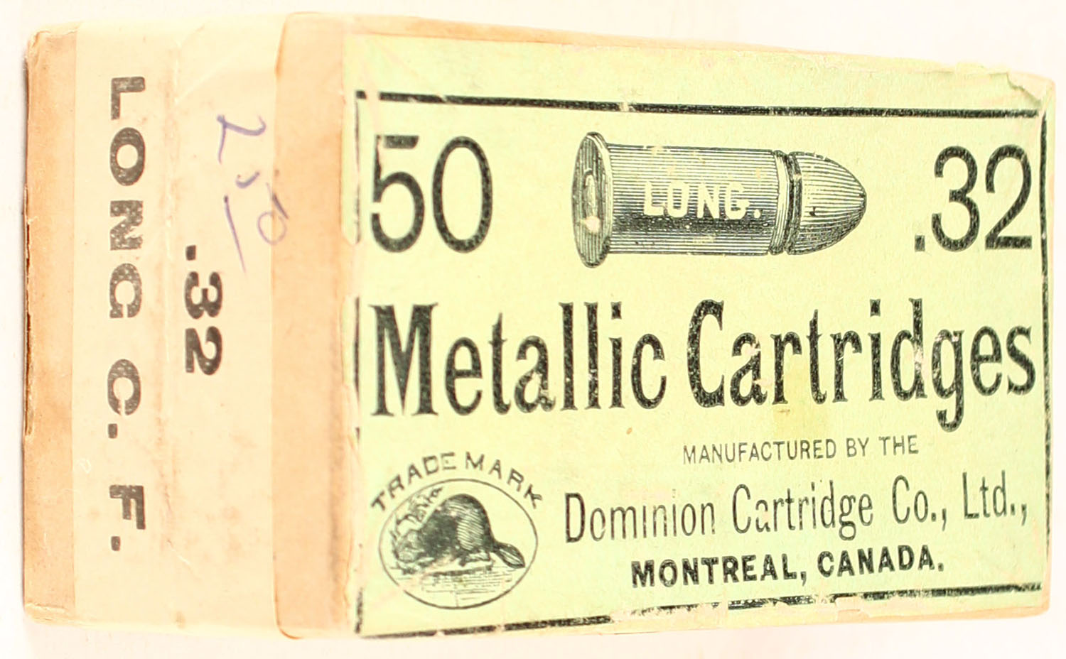 Dominion, Metallic Cartridges, .32 Long, FULL & SEALED, 2pc. Buff box with green top & white side sealing labels, box is solid with excellent to minty color, only very minor shelf wear, corners are mostly sharp, edges are crisp, labels are intact, left end has been written on. Grade: Excellent ++ - Value: 40 to 200