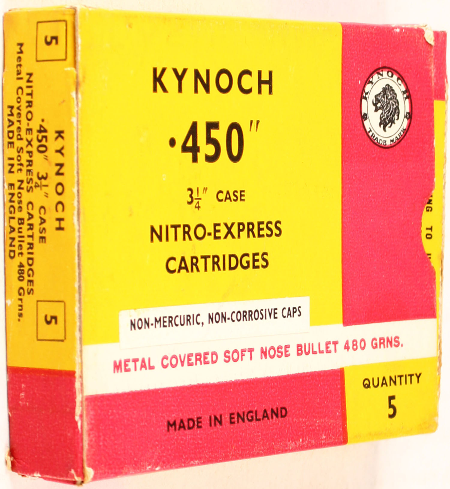 Kynoch, .450 Nitro-Express Cartridges, 480 Grns. Metal Covered Soft Nose Bullet, Full, 1pc. Yellow red & white box with white ''Non-Mercuric, Non-Corrosive Caps'' Over-Label, box is solid with excellent color, very minor age soiling, right end flap is torn, minor corner wear, very minor edge wear, child warning stamp on bottom, ammo is excellent. (1307) Grade: Very Good ++ - Value: 20 to 60