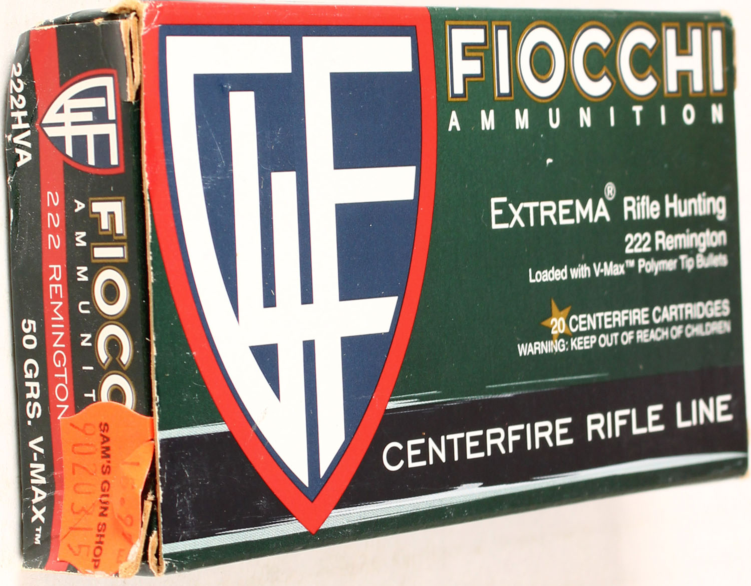 Fiocchi, 222 Remington, 50 Grain V-Max, Full, 1pc. Multi-colored box, box is solid, has excellent color, Ammo is excellent. Grade: Excellent ++ - Value: 20 to 80
