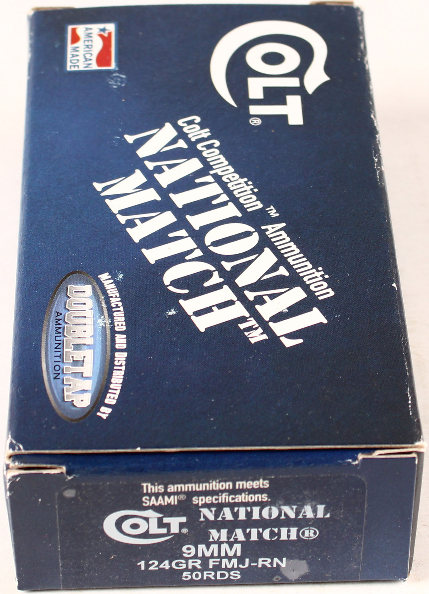 Colt, Doubletap, National Match, 9mm, 124 Grain FMJ-RN, Full, 1pc. Multi-colored box, box is solid, with excellent color, Ammo is excellent. Grade: Excellent ++ - Value: 20 to 80
