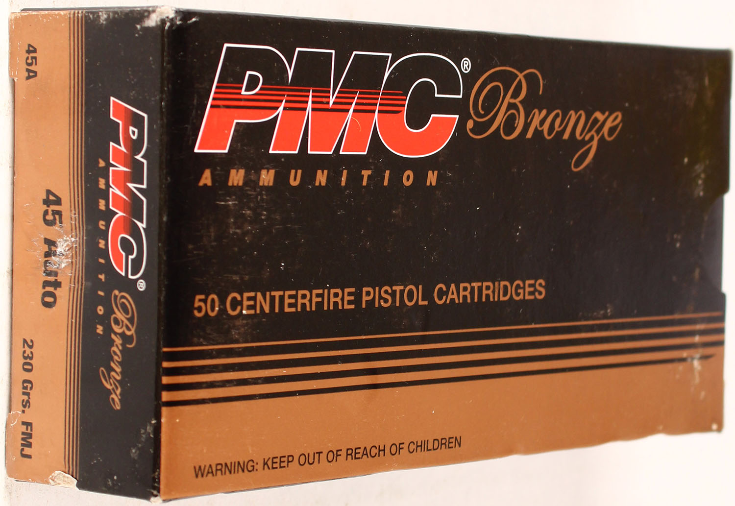 PMC, Bronze, 45 Auto, 230 Grain FMJ, Full, 1pc. Multi-colored box, box is solid, but has light shelf wear with excellent color, Ammo is excellent. Grade: Excellent + - Value: 20 to 80
