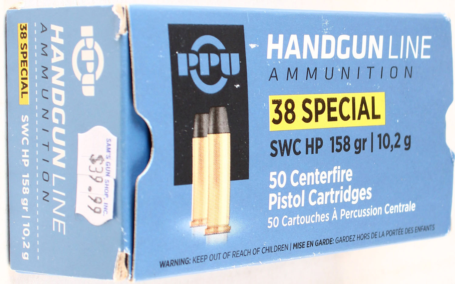 PPU, Handgun Line, 38 Special, 158 Grain SWC HP, Full, 1pc., Multi-colored box, box is solid with great color, Ammo is excellent. Grade: Excellent ++ - Value: 20 to 80