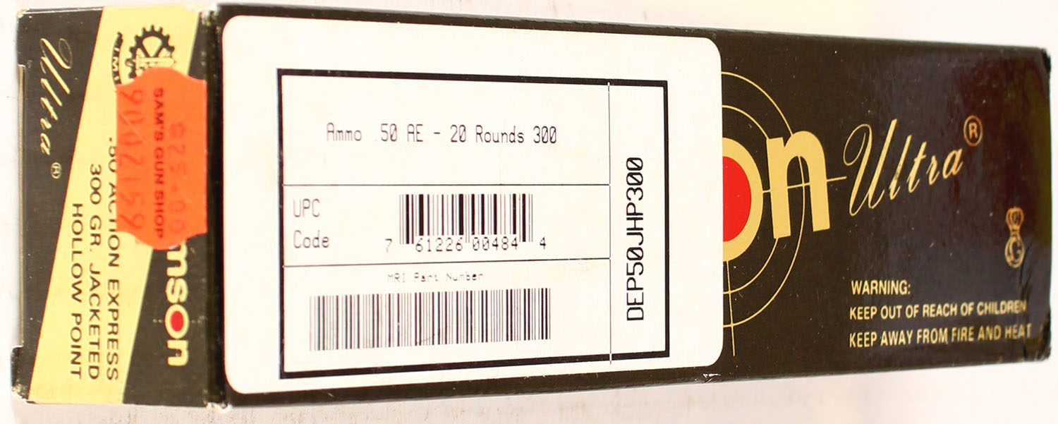 Samson, Ultra, 50 AE, 300 Grain JHP, Full, 1pc., Multi-colored box, box is solid with great color, Ammo is excellent. Grade: Excellent ++ - Value: 20 to 80