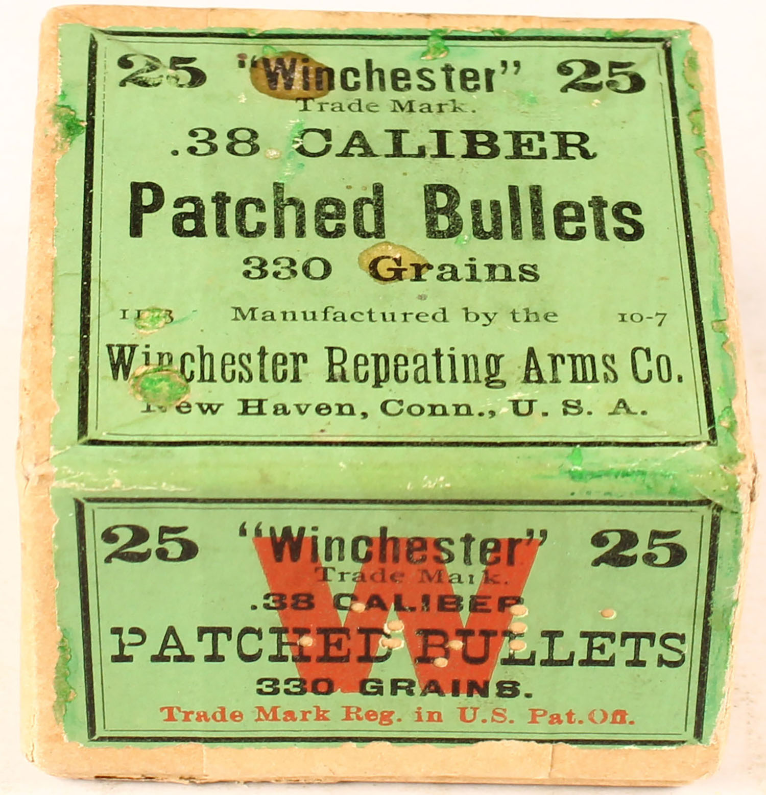 Winchester, .38 Patched Bullets, 330 Gr., 2pc, Full, buff box with green, black & red label. Grade: Excellent + - Value: 20 to 60