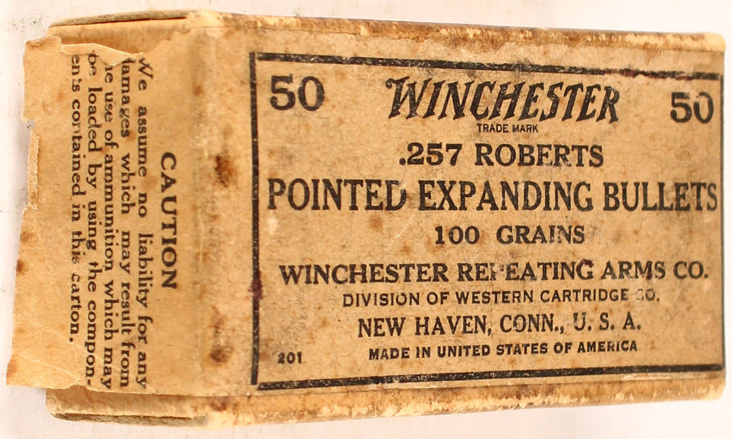 Winchester, .257 Roberts Pointed Expanding Bullets, 100 Gr., 2pc, Full, buff box with buff & black label. Grade: Excellent - Value: 10 to 50