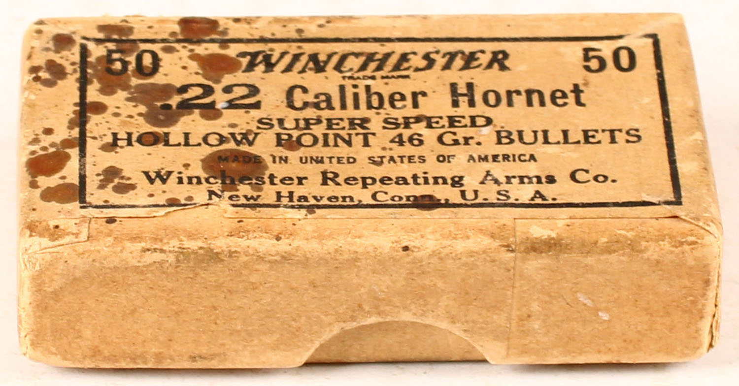 Winchester, .22 Cal. Hornet Super Speed Hollow Point, 46gr, Bullets, 2pc, Full, buff box with buff & black label. Grade: Very Good - Value: 6 to 30
