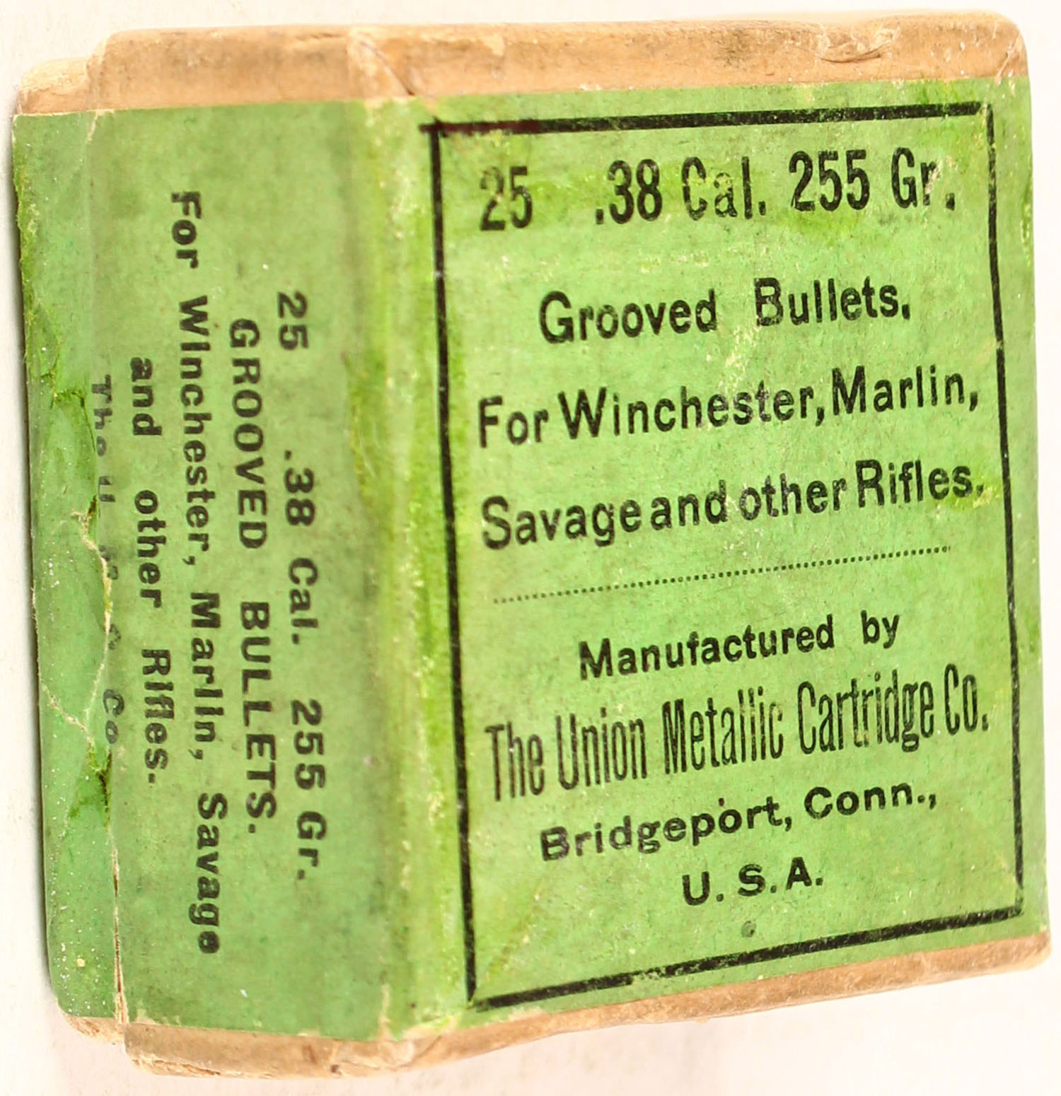 UMC, .38 Cal. 255 Gr. Grooved Bullets, Full, 2pc. Buff box with green wraparound label, box is solid with excellent color, minor age soiling, very minor corner wear, edges are mostly crisp, label is intact, bullets are excellent. Grade: Excellent - Value: 20 to 60