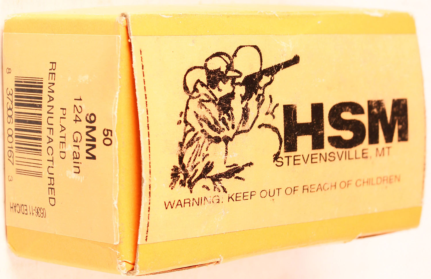HSM, caliber 9mm, 124 Grain, Full, 1pc., orange box, box is solid with very nice colors, Ammo is excellent. Grade: Excellent - Value: 10 to 100