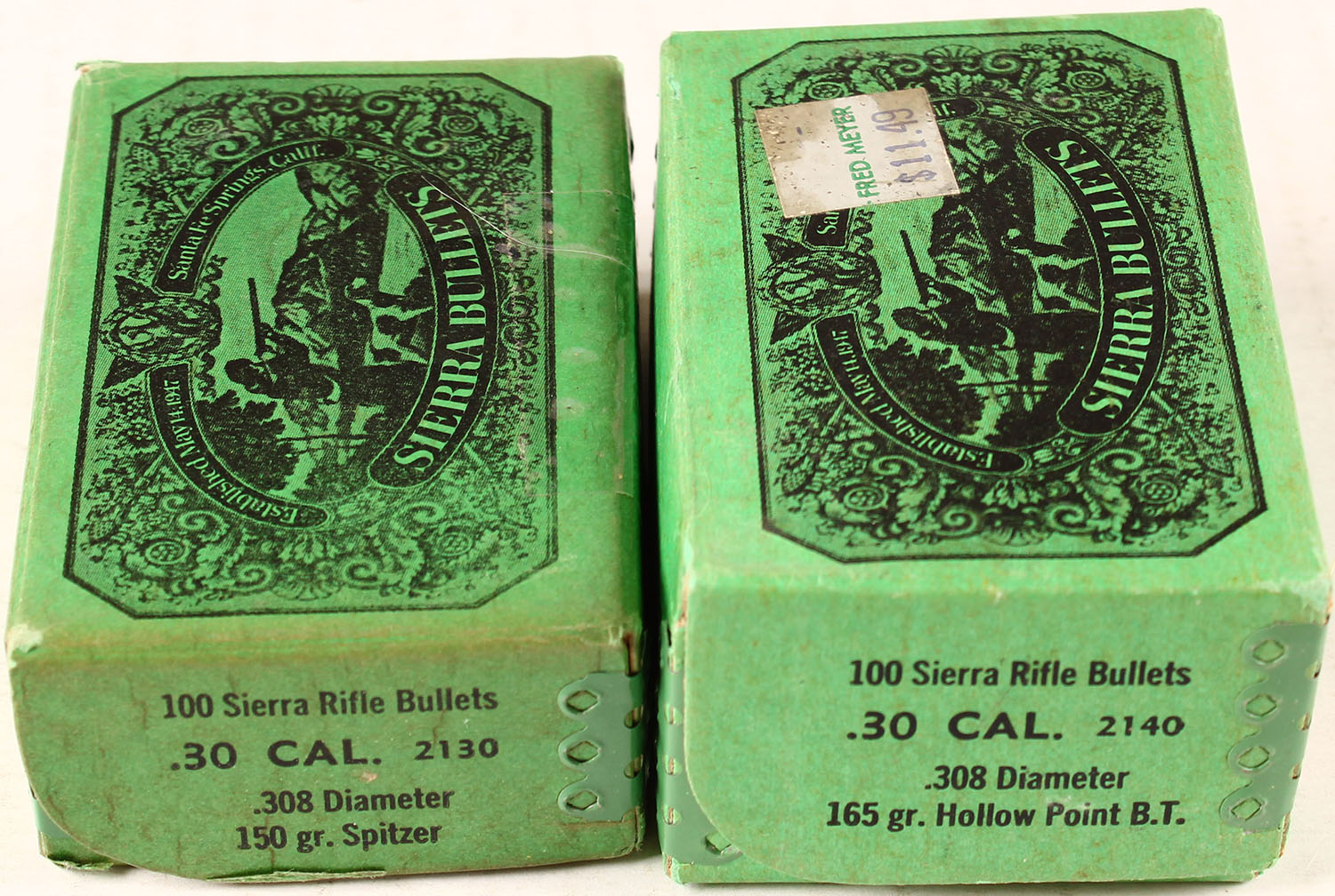 Sierra, Lot of (2) bullet boxes, Both .30 Cal (.308 Diameter), (1) box 165 Gr. Hollow Point Boat Tail, (1) Box 150 Gr. Spitzer, both boxes full & excellent, bullets are minty. Grade: Excellent - Value: 30 to 90