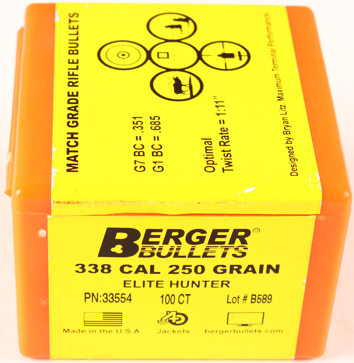Berger, Match Grade Rifle Bullets, .338 Cal. 250 Grain, Elite Hunter, Full, Orange plastic box is near mint, bullets are mint. Grade: Excellent ++ - Value: 10 to 50