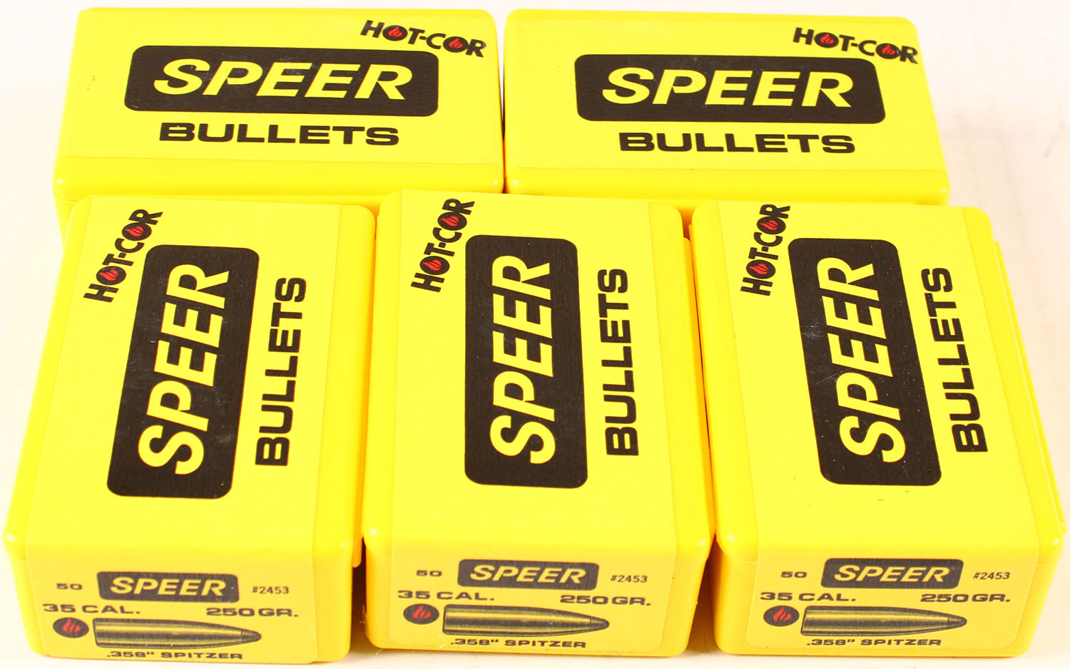 Lot of 5 Speer, Hot-Cor, caliber 35, 250 Grain Spitzer, FULL & SEALED, 1pc., multi-colored box, box is solid with great colors, Bullets are excellent. Grade: Excellent + - Value: 60 to 200