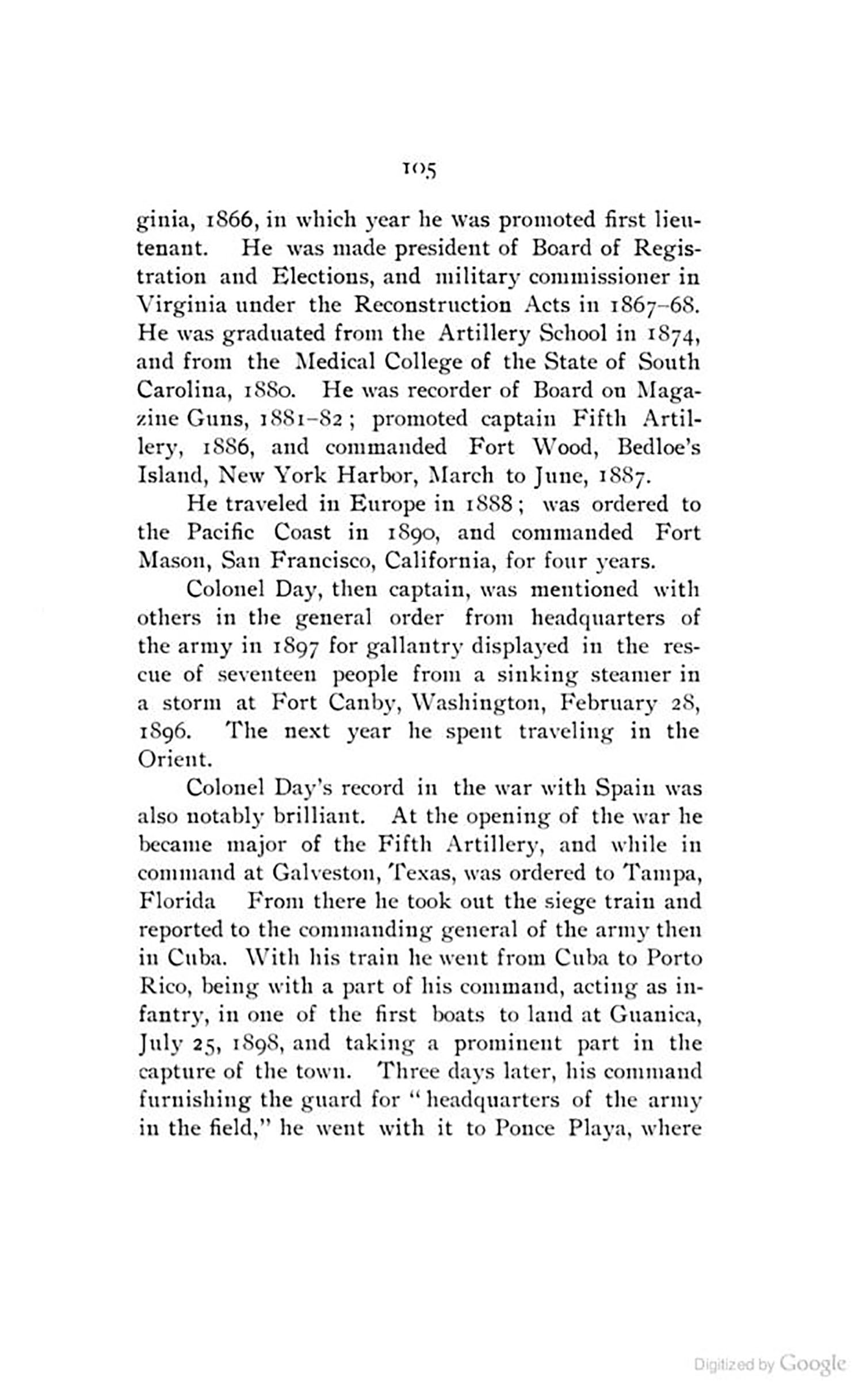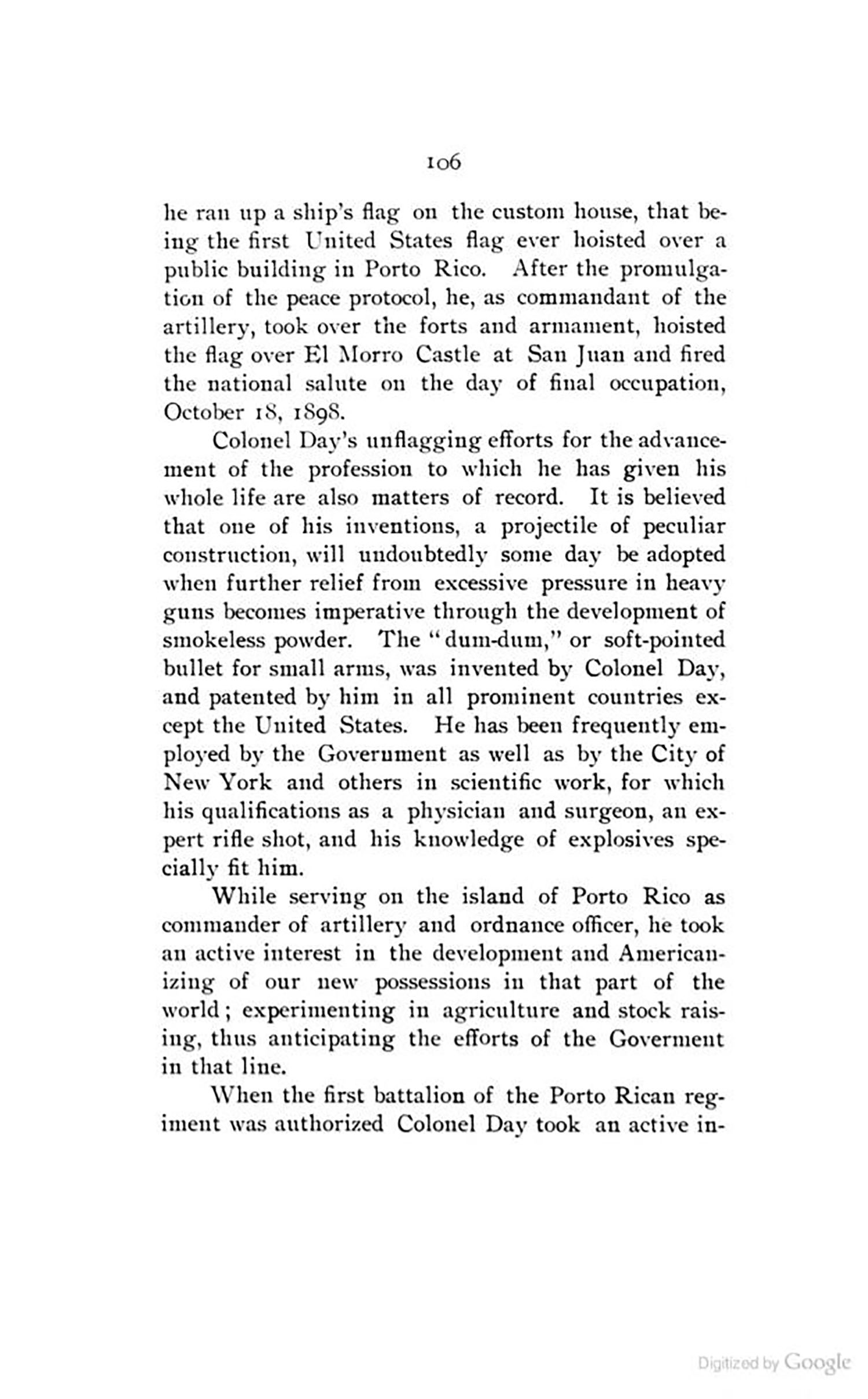 In one article there is a snippet of S.A. Day being put in charge of a few army forts in the U.S., during which time he was involved in the development of the dum dum bullet. He graduated from the Medical College of the State of South Carolina in 1880 & was known to practice as a physician & a surgeon, even caring for Jefferson Davis, the ex-president of the Confederacy. Shortly before retirement & at the opening of the Spanish War, he was commissioned major & ordered to Cuba. At the promulgation of the peace protocol he, as commandant of the artillery, hoisted the American flag over El Morro Castle at San Juan, Porto Rico, & fired the national salute on the day of occupation, October 18, 1898.