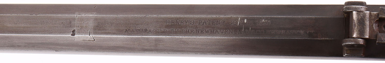 FANTASTIC Henry Repeating Rifle, First Variation, .44 Henry Cal., MFG: 1864, SN: 6550 Lever Action Rifle, Designed by Benjamin Tyler Henry & produced by the New Haven Arms Company. Henry's were used in the Indian Wars & by the Union during the Civil War. They were favored for their greater fire power than standard issue carbines, though at $30 to $40, they were a very expensive option in their day. This mid SN rifle still retains first variation rifle characteristics such as the pronounced ''Henry Drop'' profile on the rear of the receiver & the three flats on the receiver ring (receiver bridge) immediately behind the receiver & barrel joint. On this example, the original wood stock is very good to excellent & solid. The stock has been cleaned & lightly sanded & reoiled, displaying numerous small & minor dings, scratches & contusions consistent with period use. There are a couple of short & tight hairline cracks near the toe. The wood fit is very good with some shrinkage. The metal finish on the 24'' barrel has worn & toned to a thin brown patina, with a mix of added finish & with edge wear & areas of thinning worn to a gun metal gray. There are some small nicks, contusions or abrasions, & surface freckling, but no real pitting or rust. The barrel has a professionally filled 2nd rear dovetail approximately 6'' from the receiver ring. The brass frame & buttplate have both likely been cleaned in the past, but have developed nice aged color. Buttplate has a hinged trapdoor were an original 4pc hickory cleaning rod would be originally stored, although not currently present. Bore is fair, with areas of pitting amongst strong rifling. The rifle has a nickel silver front sight blade & third style folding leaf rear sight with 900 yard notch at the top of the leaf. Present are the typical sling attachments on the left side of the stock & barrel, & the faint remains of the ''Henry Bump'' can be seen below the sling provision on the stock. The top barrel flat is roll-stamped with the slightly larger style legend: ''HENRY'S PATENT. OCT. 16. 1860 / MANUFACT'D BY THE NEWHAVEN ARMS CO. NEWHAVEN. CT.'' in two lines forward of the rear sight. The serial number is stamped on the top of the barrel between the rear sight & the receiver. Matching SN's are stamped on the inside of the buttplate & on the left side of the lower tang beneath the wood. The hammer, lever & trigger are case-hardened, although the case-color has mostly worn away & developed a brown patina. There is the remains of a ''W'' proof stamping on the lower tang, which has been speculated was the inspection stamping of Oliver Winchester. The hammer has borderless knurling on the spur. All screws fit & line up correctly, are mostly unbuggered & appear original. While it is reported that as many as 14,000 Henry rifles were produced. Production of the Winchester 1866 rifle was SN intermixed starting around 12,000, so some speculate fewer that 14,000 were actually produced. With such a low production total & their heavy use during the Civil War, Indian wars & Western frontier movement, any Henry rifles is always highly collectable, but especially when found with all SN matching parts & in relatively unmolested condition such as this rifle presents. Antique, No FFL Req. - Value: 20000 to 35000