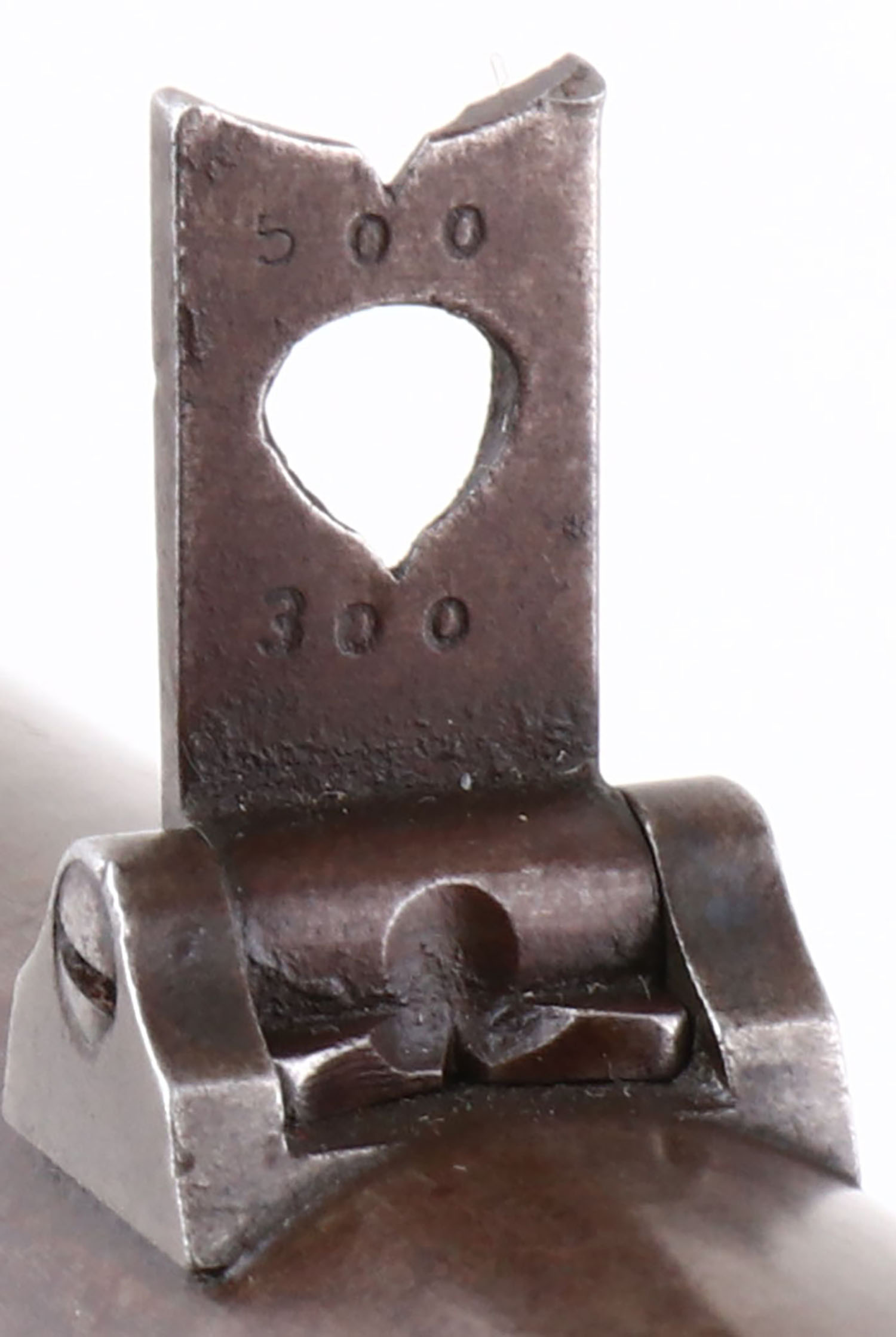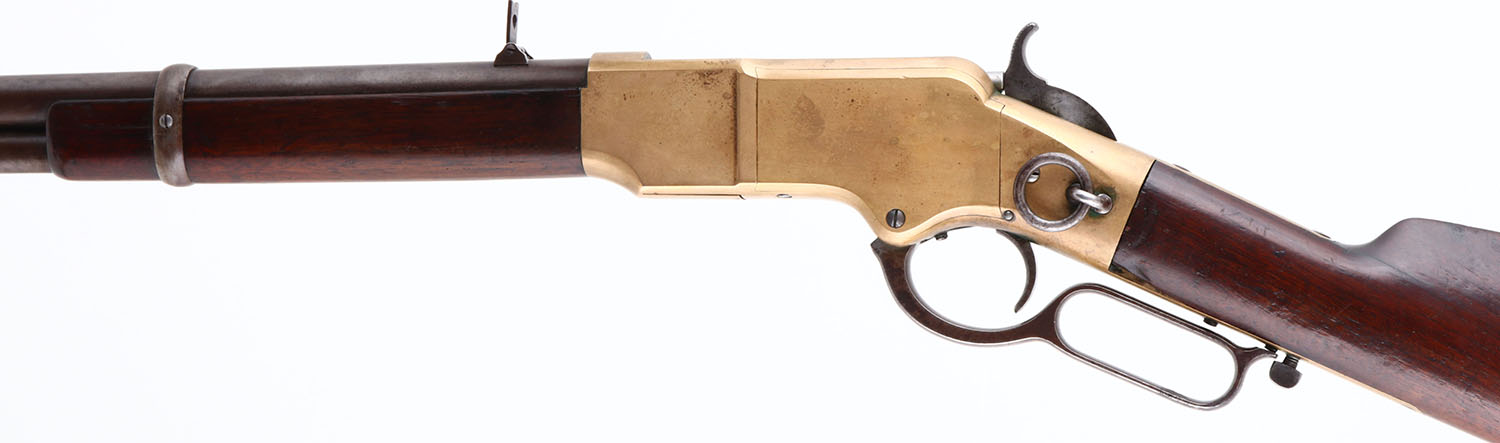 FANTASTIC Winchester, Model 1866 Saddle Ring Carbine, Early First Variation, .44 Henry Cal., MFG: 1866, SN: 14412, Lever Action Carbine, This is a FIRST YEAR carbine. Its generally accepted that serialization for the Model 1866 started at 12,000, with earlier SN's allocated to the Henry rifle. If that is correct, this is the 2,412th the 1866 produced. Like all early first variations, the SN is stamped on the inner left side of the lower tang, displays the flat sides, ''Henry Drop'' contoured receiver, the two upper tang screws, early screw layout on receiver, flat loading gate, & early short length forend. It also carries the early 20'' Round ''HENRY'' stamped barrel, Full mag. The original wood stocks are excellent & solid, retaining the majority of the original finish. The stock has a tight 2'' hairline crack emanating from the upper tang & a small missing chip at the corner of the lower left tang. The stock carry minor handling marks, scrapes & small contusions. Barrel, mag, lever & hammer have toned to a thin brown patina, with a couple of spots of rust pitting. The brass receiver has a nicely aged patina. The early variation flat loading gate displays excellent factory blue. Bore is very good, with spotty areas of roughness amongst strong riffling. The barrel carries the original flip-up rear sight, with marking at 100, 300 & 500 YDS & standard pinch blade barrel band front sight. Stock carries a smooth trapdoor crescent brass buttplate. A staple mounted saddle ring is located on the left side of the receiver. Tight smooth action & all appears mechanically sound. This is a very rare, all original, high condition & very collectible First Year 1866 SRC.* Antique, No FFL Req. - Value: 20000 to 30000