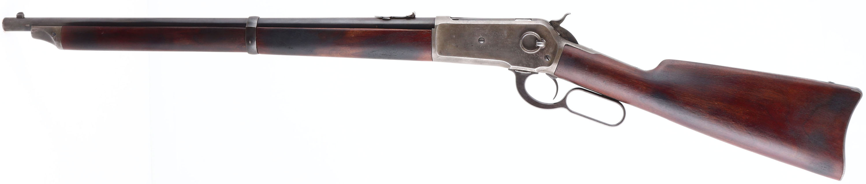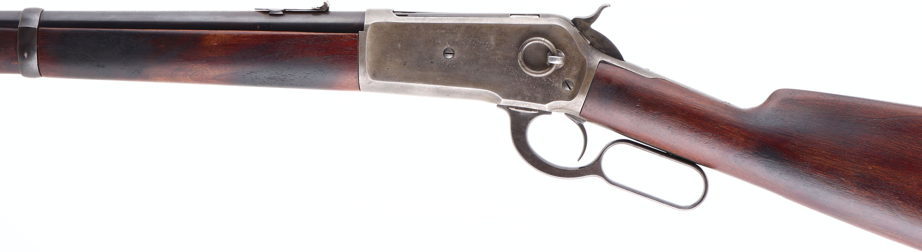 VERY RARE Winchester, Model 1886 ''Long Musket Forearm Style'' Saddle Ring Carbine, CAL: .45-70, MFG: 1889, SN: 28675, Lever Action Carbine, 22'' Round barrel, This early production carbine has the distinctive full length musket style forearm. 1886 SRC rifles with SN's below 30,000 were produced with these full length forends. These carbines were a rare variation. There were 159,996 Model 1886 rifles produced. Of the total production, only 36,524 were in 45-70 & only 6,651 carbines were produced in all calibers & barrel lengths. Of the 6,651 carbines, only 1,911 were in 45-70. Also, 352 of the 6,651 carbines were produced with ''Long Wood'', & of those only 137 were in .45-70 caliber. That makes this carbine one of only 137 examples produced in this configuration. The straight grain walnut stock & full-length forearm are excellent & solid. The stocks appear to have been cleaned, likely lightly sanded, & re-oil finished or stained. The wood remains proud to the metal in most areas, with few minor handling marks or tiny contusions. There is a thin sliver missing along the edge of the upper tang on the left side & up against the receiver. The barrel retains 90% coverage of blue finish toning a bit plum brown. The case-hardened receiver displays the faded smokey outline of faded case-colors. The top of the barrel is roll-stamped ''- MANUFACTURED BY THE-/- WINCHESTER REPEATING ARMS CO. NEW HAVEN CONN. U S. A-'' in two lines with arrows on either end of the marking. The caliber designation ''45-70'' is stamped on the top of the barrel between the rear sight & the receiver. The upper receiver tang is roll-stamped ''-MODEL 1886-''. The lower receiver tang is roll-stamped with the ''1884/1885'' patent markings in two lines behind the trigger & the SN ''28675'' in script letters ahead of the rear tang screw. Bore is excellent & bright. Barrel carries a block mounted front sight with steel blade & a folding 3 leaf rear sight. Receiver carries the staple mounted saddle ring. The stock has a carbine style buttplate. Forend has the correct model 1876 style forearm cap & spring fastened lower barrel band. A caliber .40-82 W.C.F. Model 1886 full stock carbine, SN ''14105'' is illustrated & described on page 308 of ''THE WINCHESTER BOOK'' by George Madis. Madis notes that all Model 1886 carbines are scarce & that only a few early production Model 1886 carbines were manufactured with full-length forearms. This rifle was previously sold with a correct Cody Winchester Factory Letter confirming configuration as a carbine, caliber & production date & a Winchester Rarity letter from the Cody records. However, those original letters have been misplaced by the consignor, but we do have a copy of the factory records letter. This very rare & unique carbine is highly collectible & would be a fantastic addition to any lever collection. Antique, No FFL Req. - Value: 10000 to 15000