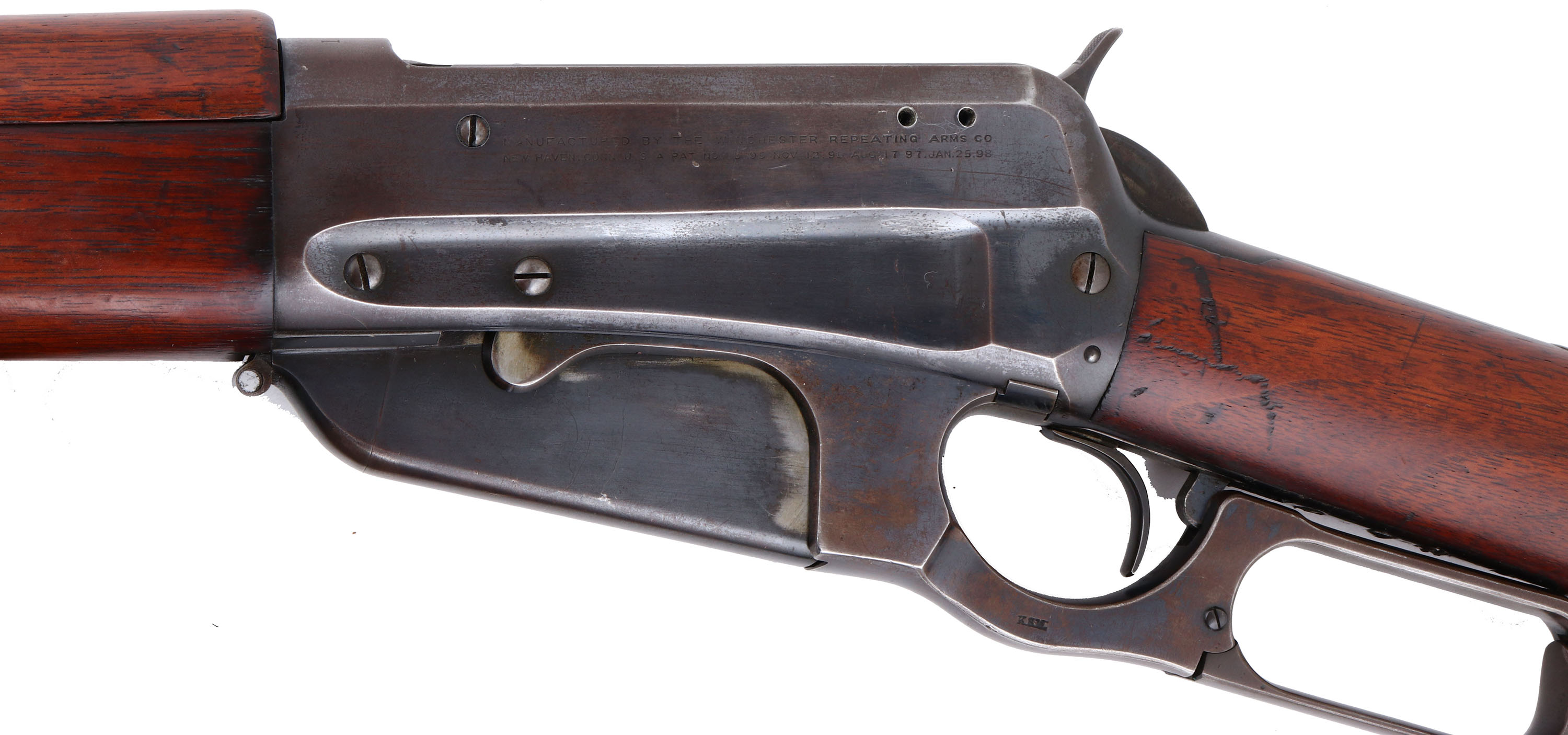 EXCEEDINGLY RARE Winchester, Model 1895 ''National Guard of Colorado'', CAL. Unmarked 30-40 Krag, MFG. 1899, SN: 19855, Lever Action, 28'' Round barrel. The right side of the receiver has the Colorado National Guard marking: ''NATIONAL GUARD OF COLORADO.'' The factory American walnut musket stocks, with finger groove forearm & hand guard are excellent, solid & original. The excellent wood finish appears original, with small scratches, scuffs & contusions. There is a large gouge on the bottom right side of the forearm, which has been smoothed & touched up. The original blue metal finish is 80% on barrel, 50% on receiver, mag & lever, with areas of loss having a thin brown patina. The top of the receiver is marked ''1D13.'' The left side of the receiver has standard Winchester markings. The musket lacks a caliber marking. The ''KSM'' Kelly S. Morse military inspectors markings are stamped on the lever & buttplate. Morse is listed as an inspector for the 1895 US contract musket. 10,000 of these rifles were purchased by the Ordnance Department with 9,900 of them being sold to Cuba. If correct, that leaves just 100 being sold to state militias of which this example was assigned to Colorado. Barrel carries a pinned blade front sight, rear aperture sight graduate to 1,800 yards & marked ''200,'' ''300,'' ''500,'' & ''700'' on the left side. Fitted with bayonet lug on the front barrel band, sling swivels & stacking loop. Comes complete with a rare ''Winchester Repeating Arms Co.'' marked bayonet, including the even rarer original metal & leather scabbard, which retains traces of original blue on the hardware. Bore is excellent. The stock carries a sliding trapdoor carbine buttplate. These Colorado National Guard Model 1895 muskets are seldom encountered & when found generally show hard use. These 1895 muskets were used extensively by the Colorado National Guard in suppressing miner's unions during the Colorado Labor Wars of 1903 & 1904. This very scarce Model 1895 variant is missing from even the most advanced Winchester collections. This unique Western American rifle of provenance is an excellent example & is very collectible in this complete & fine condition. FFL or C&R Req. - Value: 5000 to 10000