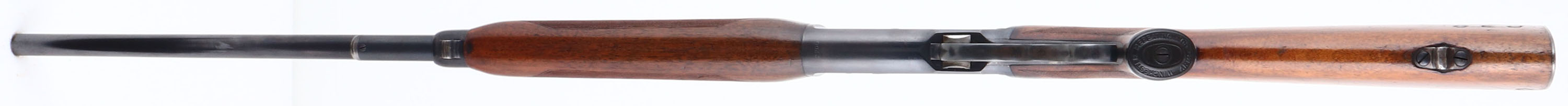 Winchester, Model 71 Deluxe Long Tang, marked 348 W.C.F., MFG. 1936, SN: 2200 (2nd Year Production), Lever Action Rifle, 24'' Round barrel, 2/3 tube mag holds 4 cartridges. Improved model 1886, with just 47,254 made & far fewer as deluxe models which are in high demand amongst collectors & command premium values. The checkered & capped pistol grip wood stocks are near excellent, solid & original. They are stamped with ''CEJ'' on both sides of the stock near the buttplate. It is well done & may be an organizational stamping, but the origin is unknown. The stocks do show thinning wear of the original finish at the carry points & around toe & buttplate. Stocks also have several minor scratches & contusions. Metal finish is 90% coverage of original blue on barrel & mag., 80% on receiver with loss on the belly due to carry wear. Lever & cap show flaking, retaining 50% on lever, 70% on forend cap. The rifle carries the rare 100 & 200 yard adjustable breech bolt peep sight, with a blank filled rear dovetail & hooded ramp front sight. Factory checkered metal buttplate. Excellent bore. Factory sling mounts. Nice looking & original early long tang Deluxe 71 rifle.* FFL or C&R Req. - Value: 2500 to 3500