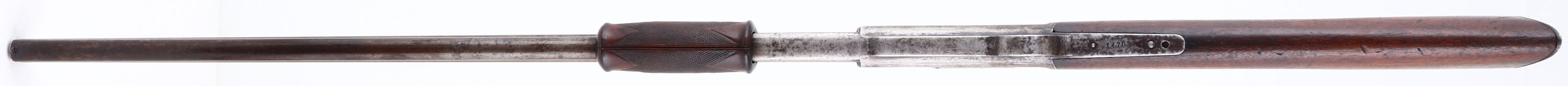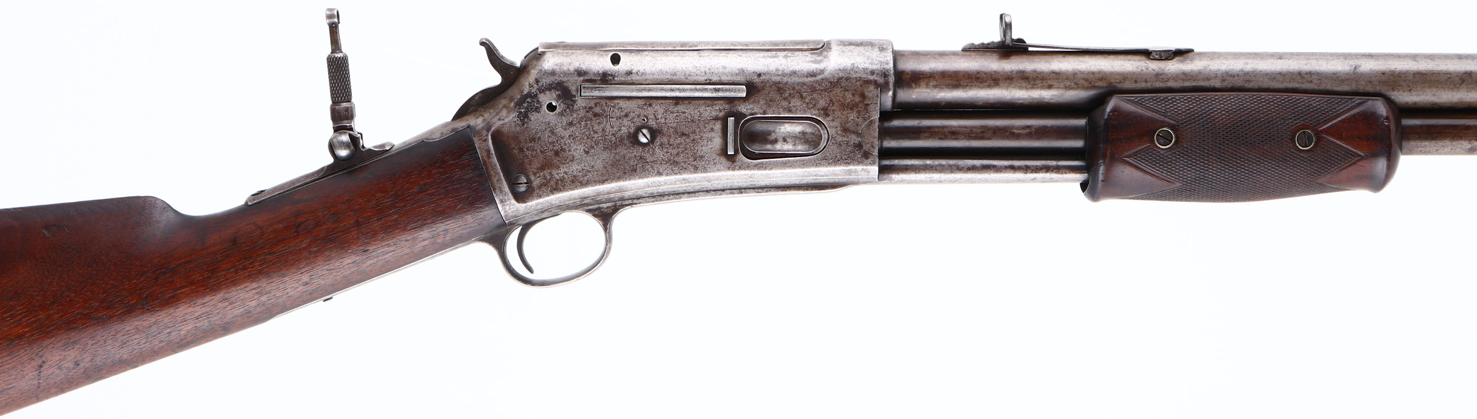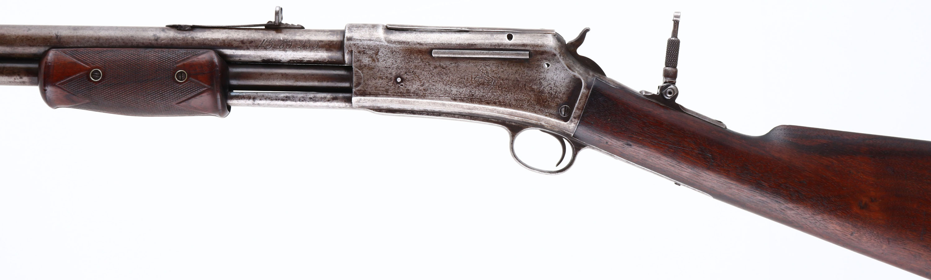 RARE Colt Lightning, Large Frame, Marked .45-85-285 CAL., MFG. 1888, SN: 1470, Slide Action Rifle, 28 1/4'' Round barrel, Full mag. Early, second year rifle. The factory stocks are excellent, with the correct checkered forend & non-checkered stock. The stock has a couple of tightly repaired 1'' cracks at the toe. The checkering on the forend remains very good, with a couple of small 1/2'' hairline cracks & edge nicks. The stocks appear to carry the original finish, with several small dings & minor scratches. The metal finish on barrel, mag & receiver has worn mostly gun metal gray, with spotty areas of brown patina. Rifle fitted with a Lyman flip-up adjustable tang sight, while the barrel carries an adjustable buckhorn rear & Rocky Mountain silver blade front sights. Bore is very good, with strong rifling & some light roughness. Crescent metal buttplate. Smooth tight action. One of only 6,496 large frame rifles were produced from 1887-94. Overall, a very nice example & fairly rare rifle. Antique, No FFL Req. - Value: 2000 to 4000