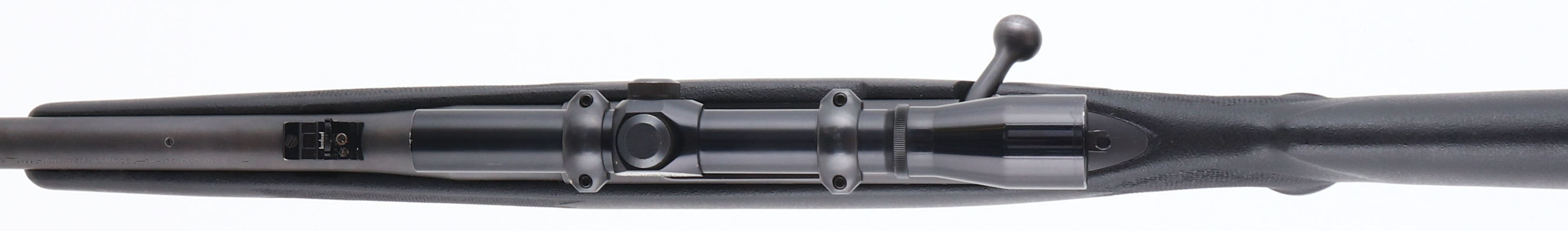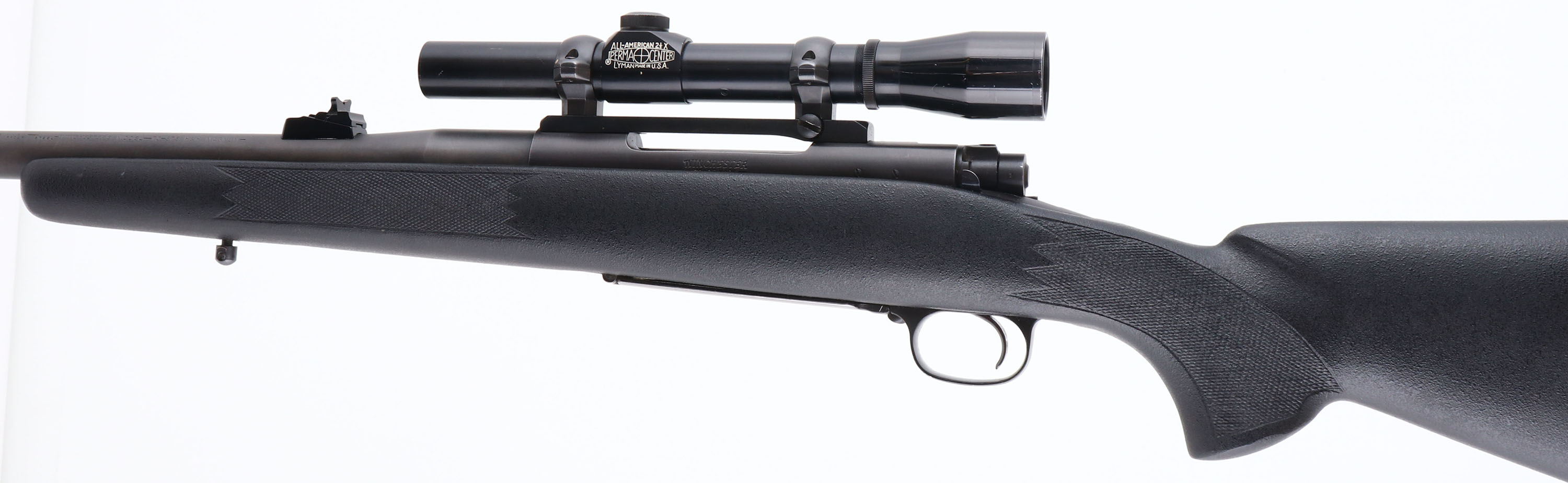 Winchester, Model 70, CAL: 375 H&H MAG, MFG: 1965, SN: 744670, Bolt Action Rifle, 21'' barrel. The checkered & flat pistol grip synthetic stock is excellent. There is an extra hole in the forend belly of the stock behind the front sling stud. The satin metal gray finish on the barrel is excellent. The satin black finish on the receiver rates 98%. 30% original blue left on trigger guard & floorplate. Bore is excellent. The receiver holds a Lyman All-American 2 1/2X scope, mounted on Redfield mounts. The barrel has a Williams adjustable rear sight & ramp elevated tall blade front sight. One additional screw filled hole in barrel just ahead of rear sight. Solid rubber recoil pad. Sling studs. FFL or C&R Req. - Value: 400 to 800