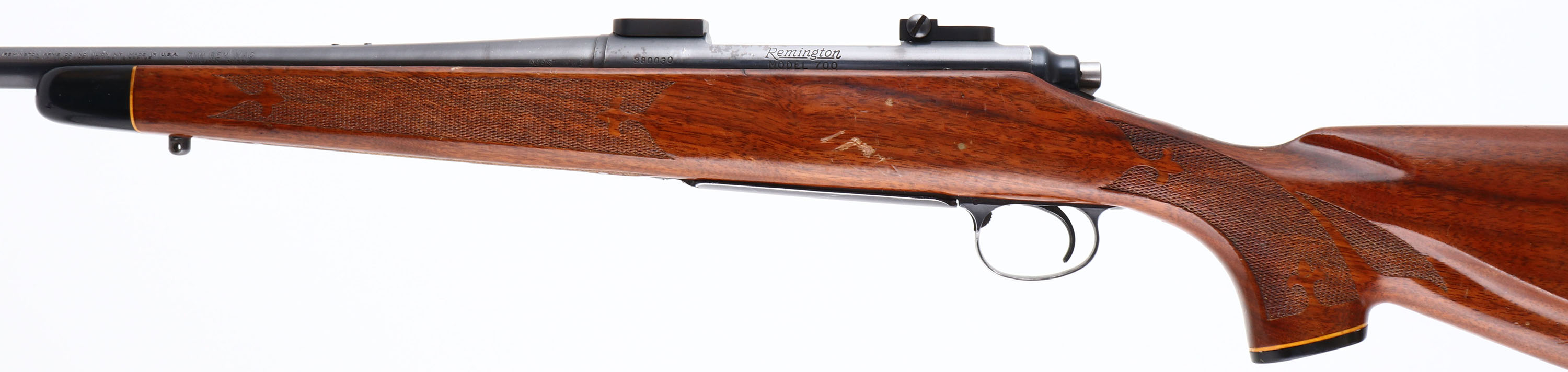 Remington, Model 700, CAL: 7MM REM MAG, MFG: 1968, SN: 380030, Bolt Action Rifle, 24'' barrel. The original checkered, cheeked & flat pistol grip wood stock, with ebony forend tip & grip cap is very good. The original finish is very good, with several scrapes, scuffs, scratches & minor dings. The original metal blue finish rates 90% overall. Bore is excellent & bright. The receiver holds Burris scope blocks, while the barrel has screw filled holes from rear sight removal & a ramp elevated front blade sight. Stock carries a Remington ventilated recoil pad. Sling studs present. An original condition hunting rifle. FFL or C&R Req. - Value: 400 to 800