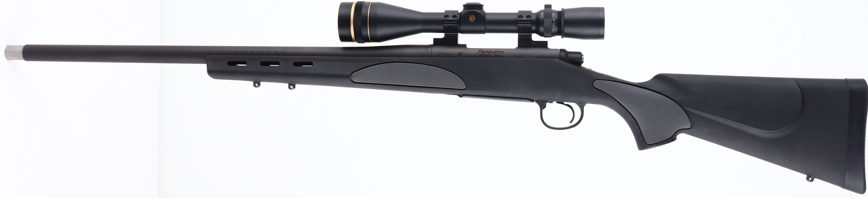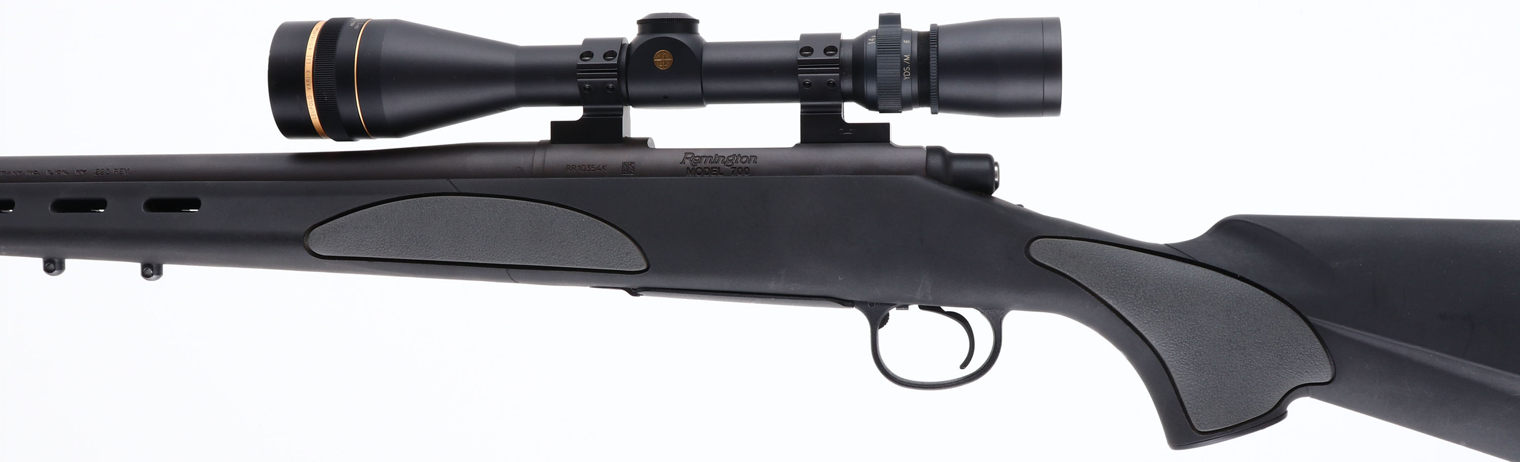 Remington, Model 700, CAL: 223 REM, MFG: Modern, SN: RR10354K, Bolt Action Rifle, 22'' barrel. The original pistol grip & cheeked synthetic stock, with grey over mold grip panels & vented beavertail forend, is excellent, with minor surface scrapes & handling marks. The factory matte black finish on the barrel & receiver is excellent, rating 99% overall. Bore is excellent & bright. The receiver holds a Leupold Vari-X III 4.5-14x40mm scope, mounted on Talley rings. No open sight provisions. Stock carries a factory ''SuperCell'' recoil pad. Sling studs present. A quality small caliber hunting rifle. FFL Req. - Value: 500 to 1000