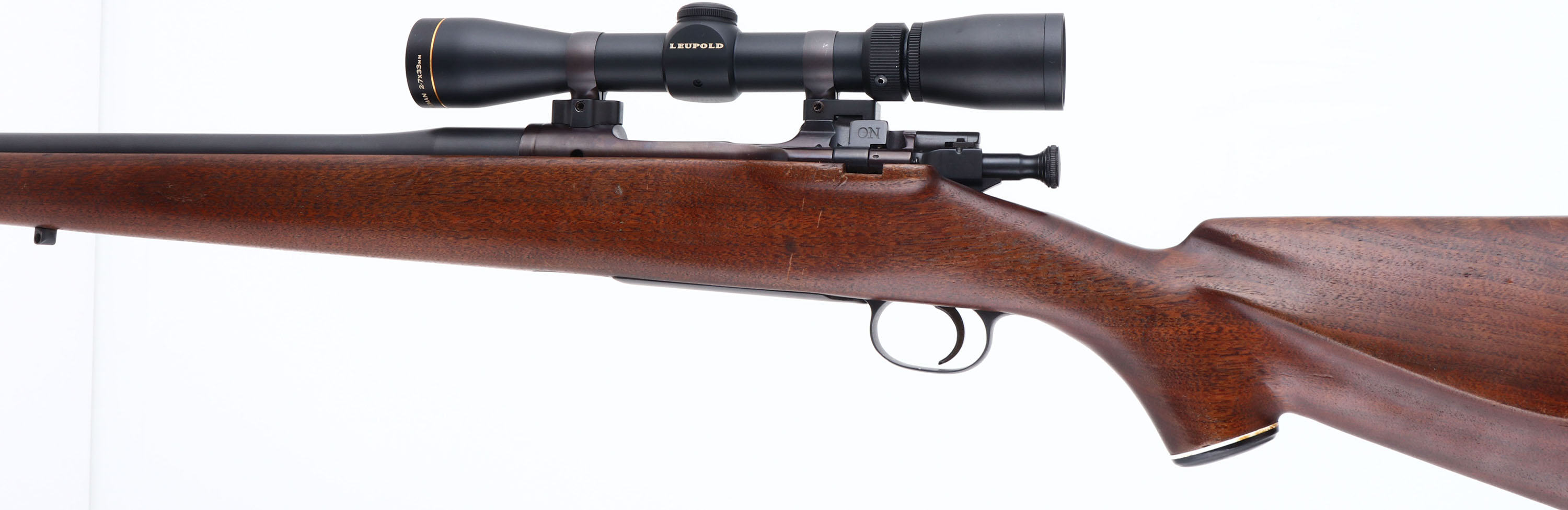 Custom Rifle, Remington, Model 1903A3, CAL: 280, MFG: 1942 (Receiver), SN: 3465339, Bolt Action Rifle, 20'' barrel. The full length, cheeked & capped flat pistol grip wood stock is excellent. There are minor surface scrapes & dings to the finish. There is a tight 1'' stress crack coming off the back of the receiver. The satin black finish on the barrel, floor plate & trigger guard rates 99%. The metal blue finish on the receiver rates 97%, toned to a plum patina. Bore is excellent. The receiver holds a Leupold Rifleman 2-7x33mm scope. No open sight provisions. Sling studs present. A very nice customized rifle built off a 1903A3 receiver. FFL or C&R Req. - Value: 400 to 800