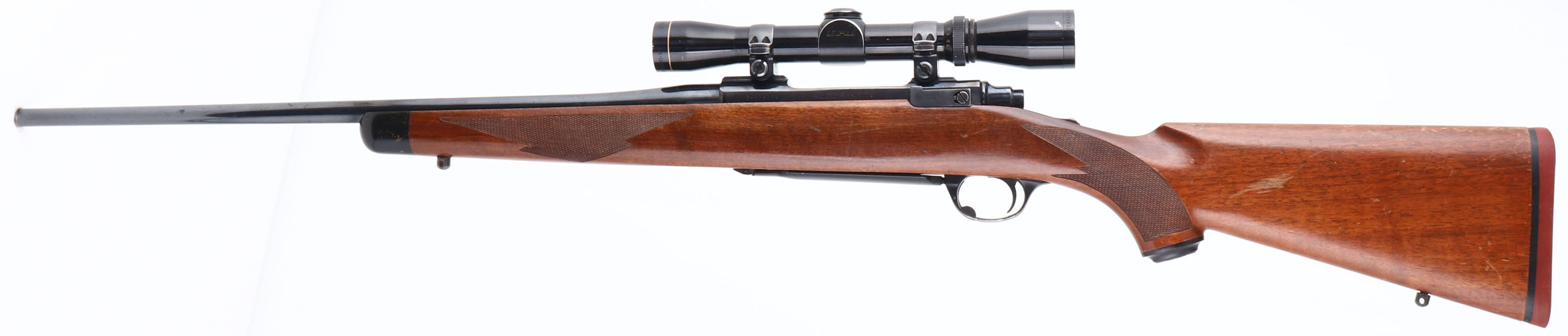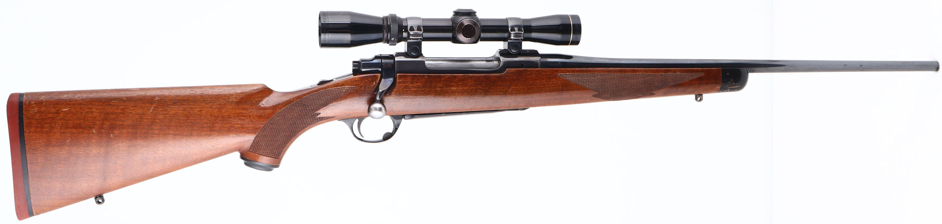 Ruger, M77, CAL: 257 Roberts, MFG: 1985, SN: 79-79255, Bolt Action Rifle, 19 1/2'' Fast tapered barrel. The checkered & capped pistol grip wood stock is excellent, with ebony forend tip. There are numerous scratches, scrapes & dings to the original finish, mostly on the comb & forend tip. The metal blue finish rates 85% overall, with edges & corners worn to metal grey. Bore is excellent & bright. The receiver holds a Leupold Vari-X II 2-7 scope, with no open sight provisions on the barrel. Stock carries a Ruger marked solid recoil pad. Sling studs. A very nice utilitarian hunting rifle. FFL Req. - Value: 500 to 900
