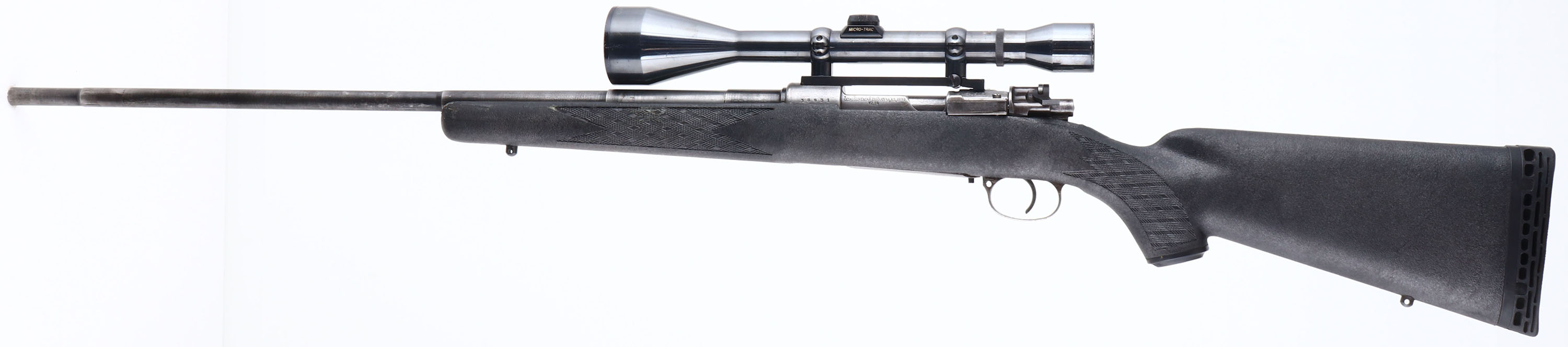 Custom Rifle, CZ, Model VZ24, CAL: 7.92x57mm, MFG: 1924-42, SN: 38931 (Receiver), Mauser type Bolt Action Rifle, 26'' step-down barrel. The Ram-Line checkered & flat pistol grip composite stock is very good, with minor scrapes & dings. There is a glue or epoxy substance on the right side of the fore grip in the checkering. The bolt notch was carved out. The metal finish has worn mostly gun metal gray, with remnants of remaining blue. Bore is very good, with strong rifling & visible light wear from honest use. The receiver holds a Weaver Micro-Trac K-856 scope. No open sight provisions. Sling studs. Ventilated recoil pad. FFL or C&R Req. - Value: 300 to 600